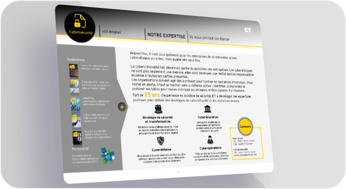 Cybersécurité vos enjeux NOTRE EXPERTISE ils nous ont fait confiance Aujourd’hui, il n’est plus pertinent pour les entreprises de se demander si une cyberattaque aura lieu, mais quand elle aura lieu. Publications Cap sur la cyberrésilience : La cybercriminalité fait désormais partie du quotidien des entreprises. Les cyberattaques anticiper, résister, réagir ne sont plus seulement une menace, elles sont devenues une réalité dont la responsabilité incombe à toutes les parties prenantes. Les organisations doivent agir dès à présent pour contrer les tentatives d’intrusion. Pour Cybersécurité : créer les rester en alerte, il faut se tourner vers la défense active : identifier, comprendre et conditions de la confiance dans un monde digital prévenir ses failles pour mieux anticiper les attaques et être capable d’y répondre. Fort de 25 ans d’expérience en matière de sécurité, EY a développé des expertises Enhancing pointues pour définir des stratégies de cybersécurité et les mettre en œuvre. your security operations with Active Defense + Using cyber analytics to help you get on top of Stratégie de sécurité Cyberéducation cybercrime et transformation Conception et pilotage de Définition de la stratégie sécurité, mise programmes de formation, Contacts How do you find the en œuvre opérationnelle et pilotage du sensibilisation et simulation criminal before they programme de transformation adapté d’incidents sécurité commit the cybercrime? Marc Ayadi Tél. : +33 1 46 93 73 92 Partenariat [email protected] Cyberdéfense Cyberopérations EY partenaire du Pascal Antonini Forum International de Mise en place d’outils concrets dédiés à la cyber Prise en charge de la surveillance Tél. : +33 1 46 93 70 34 la Cybersécurité 2017 défense : gestion des accès, tests d’intrusion, constante d’infrastructures, détection [email protected] création d’infrastructures sécurisées et réponse aux éventuels incidents 40
