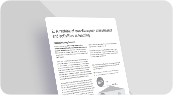 2. A rethink of pan-European investments and activities is looming Relocation may happen According to our survey, 86% of foreign investors with a logistics, production and headquarters operations may all be areas presence in the UK (75% of the sample group) have no plans to subject to review in the wake of the vote. change or relocate European operations in the next three years if the UK leaves the European single market. But 14% of those Economic decisions are no longer the primary driver for strategic present in the UK say they will change or relocate some activities if location decisions. Rather, wider geopolitical events and the impact Brexit happens. of resulting changes are becoming increasingly important factors to consider in investment decisions. Overall, only 11% of the 254 executives we interviewed plan to modify their presence in the UK and consequently, in Europe in the wake of Brexit. The precise consequences of a Brexit remain to be established. But relocation will not be a UK phenomenon If the UK leaves the European single market, will you alone. Deeper trends arising from technology change and global change or relocate the following operations in the economic re-balancing are causing many companies to rethink next three years? their international investment strategies. The UK referendum also coincided with a rise in protectionist forces more widely, especially Our company is not planning on relocating operations following the election of President Donald Trump in the US. Our company is planning on relocating operations This is a potentially significant trend, considering the importance of FDI in Europe and in the UK. In 2015, the stock of inward FDI % into the EU28 exceeded 48% of GDP. This stood at 54.5% of GDP 89 11% for the UK.11 For companies in some sectors, it may be necessary Overall to move some operations from the UK to an EU27 country in order to retain access to rights enjoyed only by EU companies. So, fund management companies, insurers and banks may need to set up a new entity regulated by an EU27 member so that they can continue to sell their products throughout the single market. The UK may become a less attractive location for some companies 86% 14% and operations. But for others, its appeal may strengthen. This will depend in part upon the return to stability and the evolution Established in the UK of public policies across Europe. An optimistic view of this survey would note that 9 out of 10 senior executives are not considering either changing or relocating operations. Yet, what we see now might be a once-in-decades change of 98% location strategies in Europe. Just as Brexit has raised questions of identity for citizens, so it also raises strategic questions for % 2 companies. Now is the right time for companies to ask themselves what their overall vision is and what general organization they Not established in the UK want in Europe. Our perception is that the current transition period brings a Source: EY’s European attractiveness survey January 2017 “strategic allocation agenda” to the table. The Brexit referendum (total respondents: 254). has had a destabilizing effect on companies everywhere. Our sample, though small, suggests that for some firms, back office, 11 “FDI Stocks”, OECD website, https://data.oecd.org/fdi/fdi-stocks.htm, accessed 29 December 2016. 12 EY’s European attractiveness survey January 2017