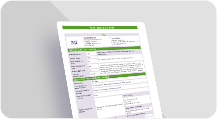 Panorama SIGR 2016 ACL ACL EUROPE LTD Pascal GADEA Greenpark-200 Brook Drive Directeur Commercial Reading, Berkshire +33 (0)1 70 70 79 88 / +33 (0)6 62 40 32 93 RG2 6UB, Royaume-Uni [email protected] www.acl.com CARTE D’IDENTITE DE L’EDITEUR Date de création 1987 Déclaration de l’éditeur sur ses particularités et éléments différenciants Effectif global 220 Effectif dédié au 30 Un éditeur spécialisé dans les SIGR / un éditeur généraliste. SIGR Effectif intégration n/r ACL GRC est une solution vous apportant une prise en rapide main sur le SIGR Web qui vous permettra de décrire vos risques stratégiques, d’améliorer la Effectif R&D SIGR 30 gestion de l’audit et du contrôle interne. ACL va combiner en option la Zone(s) puissance de ses solutions d’analyse de données avec ACL GRC. Déjà plus d’implantation Europe de 1200 clients ACL GRC dans le monde sur 15 000 clients ACL Analytics. SOLUTION(S) PROPOSEE(S) PAR L’EDITEUR Solution(s) ACL GRC Type de solution Un outil standard et paramétrable (labels, formulaires, workflows, ...) selon l’éditeur Composition de la Plusieurs modules dans une même application solution Dominante(s) selon Audit l’éditeur Club utilisateur Oui (1 réunion par an) Points forts selon Une solution web peu couteuse et très facile Créé en 2010 l’éditeur à utiliser Administré par des clients Hébergement des données Chez l'éditeur ou chez un sous-traitant de l’éditeur Nombre de projets Dans les 12 derniers mois Depuis la sortie de la solution d’implémentation En France 4 En France 10 déclarés A l’étranger 120 A l’étranger 1200 Secteurs d’activité Banque (10%), Assurance (10%), Nombre moyen des projets Industries et services (70%), Secteur d’utilisateurs par solution De 6 à 50 implémentés public (5%), Autres (5%) Couverture des axes fonctionnels* Couverture des axes techniques* Assurance Intelligence 4,0 Gestion des Acces économique 3,5 incidents Workflows 4,0 Architecture 3,0 3,5 Qualité 2,5 Gestion de 3,0 2,0 crise et PCA 2,5 1,5 Reportings 2,0 Devise 1,0 1,5 0,5 Maîtrise des 1,0 Gouvernance 0,0 risques 0,5 0,0 Personnalisation Documentation Gestion des Cartographie actions des risques Organisation Export Conformité Audit Contrôle Langue Import interne (*) Les résultats retranscrits sur cette fiche sont conformes aux réponses fournies par l’éditeur 30 / 77 Panorama SIGR 2016 – Copyright © 2016 AMRAE, en partenariat avec EY