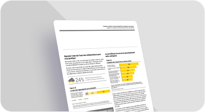 15 Appuyez-vous sur tous vos collaborateurs pour vous protéger Bien que les visites sur site, par exemple par des auditeurs internes, soient importantes, le signalement par les collaborateurs reste la façon la plus courante de détecter les fraudes ou autres pratiques non éthiques. Pourtant, près d’un quart des personnes interrogées déclare que leur entreprise ne dispose pas d’une ligne d’alerte éthique. Sans ces moyens de communication, des directives claires et un soutien affirmé de la direction, les collaborateurs hésitent à signaler les fraudes. 24 % déclarent que leur entreprise ne possède pas de ligne d’alerte éthique. Figure 15 Le suivi des signalements par la direction Pensez-vous que la hiérarchie donnerait suite à un rapport rendu par le biais du dispositif d’alerte de votre entreprise ? Jamais Parfois Toujours 32 % 21 % 6 % Base : Tous les participants (3 800) Le pourcentage de personnes ayant répondu « Mon entreprise n’a pas de ligne d’alerte éthique » ou « Ne sait pas » a été volontairement omis pour faciliter la comparaison entre les différentes réponses. Les entreprises sont plus que jamais susceptibles de faire l’objet d’un contrôle par les autorités de régulation sur leur programme de compliance. De récentes évolutions réglementaires ont eu lieu dans de nombreux pays et ont renforcé l’importance donnée aux lignes d’alerte éthique. Par exemple, au Royaume-Uni, onze des recommandations faites par la Commission Parlementaire des Normes Bancaires sur l’intégrité et la transparence des affaires ont trait à ce sujet. En parallèle, les lanceurs d’alertes sont plus nombreux que jamais à soulever des questions d’éthique. Les coûts résultant de la défaillance de la mise en place d’une structure opérationnelle de reporting en matière de compliance peuvent être exorbitants. Lanceurs d’alertes : assurez-vous d’apprendre la mauvaise nouvelle en premier La surveillance ne concerne pas uniquement votre entreprise Figure 16 La gestion des risques liés aux tierces parties 28 % 24 % 21 % 19 % 16 % 15 % Base de données des fournisseurs référencés Due diligence relative à l’intégrité des tiers Clauses d’audit/Audits réguliers auprès des tierces parties Mise en place de contrôles des tierces parties basés sur des technologies/logiciels Vérification des détenteurs du capital de la tierce partie Appel à des prestataires externes pour effectuer les contrôles nécessaires Q : En ce qui concerne les tierces parties auxquelles votre unité fait appel, quels systèmes ou processus avez-vous mis en place pour gérer et contrôler les relations avec celles-ci ? Base : Tous les participants (3 800) Plusieurs affaires récentes très médiatisées en matière d’application des réglementations ont mis en exergue l’importance de connaître les tierces parties avec lesquelles les entreprises traitent, et de savoir ce qu’elles font. Cependant, tel n’est toujours pas le cas pour beaucoup d’entreprises. Moins d’un quart des participants affirme que leur entreprise réalise des enquêtes sur l’intégrité de leurs fournisseurs et moins d’un cinquième d’entre eux estime que leur entreprise vérifie l’identité des détenteurs du capital. Les résultats montrent également que la majorité des entreprises ne contrôle pas de façon continue les actions exécutées en leur nom par les tierces parties. Seulement un cinquième des personnes interrogées affirme que leur entreprise a mis en place des clauses d’audit ou effectue des audits réguliers des tierces parties.