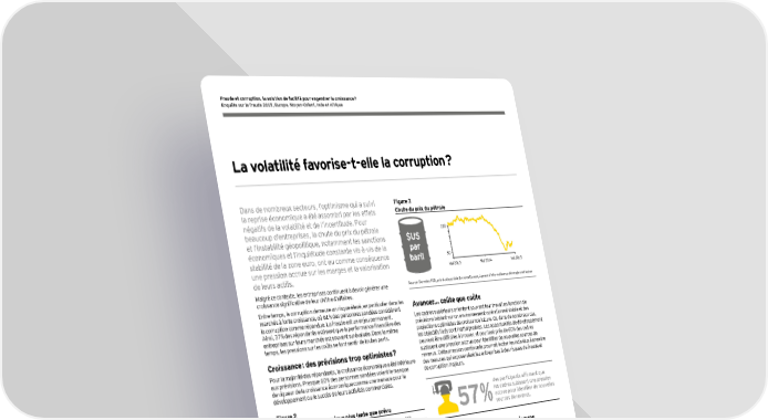 4 Dans de nombreux secteurs, l’optimisme qui a suivi la reprise économique a été assombri par les effets négatifs de la volatilité et de l’incertitude. Pour beaucoup d’entreprises, la chute du prix du pétrole et l’instabilité géopolitique, notamment les sanctions économiques et l’inquiétude constante vis-à-vis de la stabilité de la zone euro, ont eu comme conséquence une pression accrue sur les marges et la valorisation de leurs actifs. Malgré ce contexte, les entreprises continuent à devoir générer une croissance significative de leur chiffre d’affaires. Entre temps, la corruption demeure un risque élevé, en particulier dans les marchés à forte croissance, où 61 % des personnes sondées considèrent la corruption comme répandue. La fraude est un enjeu permanent. Ainsi, 37 % des répondants estiment que la performance financière des entreprises sur leurs marchés est souvent surévaluée. Dans le même temps, les pressions sur les coûts se font sentir de toutes parts. Croissance : des prévisions trop optimistes ? Pour la majorité des répondants, la croissance économique a été inférieure aux prévisions. Presque 60 % des personnes sondées voient le manque de vigueur de la croissance économique comme une menace pour le développement ou le succès de leurs activités commerciales. Figure 2 Une croissance économique plus lente que prévu Croissance économique plus lente que prévue dans notre pays 58 % Instabilité politique dans certains des pays où nous faisons affaire 32 % Incertitude quant à notre capacité d’opérer en raison de sanctions économiques ou de contrôles à l’exportation 24 % En % 54 25 20 Marchés matures 62 41 30 Marchés à forte croissance 100 Q : Un ou plusieurs de ces sujets représentent-ils un défi croissant pour le développement ou le succès de votre entreprise ? Base : Tous les participants (3 800) ; Marchés matures (1 600) ; Marchés à forte croissance (1 100) Il existe plusieurs autres risques stratégiques qui représentent un défi pour les entreprises : ► Un tiers des répondants (41 % sur les marchés à forte croissance) identifient l’instabilité politique comme source de pression supplémentaire. ► Un quart des participants mentionne l’incertitude sur la possibilité d’opérer du fait des sanctions économiques ou des contrôles à l’exportation comme une source de pression supplémentaire. ► La chute brutale des prix du pétrole (baisse de plus de 40 % entre mai 2014 et mai 2015) a fait émerger des gagnants et des perdants, et dans les pays et les secteurs qui comptent énormément sur les revenus du pétrole, l’effet négatif a été durement ressenti. Figure 3 Chute du prix du pétrole Incertitude quant à notre capacité d’opérer en raison de sanctions économiques ou de contrôles à l’exportation 24 % 20 50 100 Mai 2013 Mai 2014 Mai 2015 Source : Données FOB, prix du disponible Brent en Europe, Agence d’information sur l’énergie américaine Avancer... coûte que coûte Les cadres supérieurs orientent souvent leur travail en fonction de prévisions tablant sur un environnement opérationnel stable et des projections optimistes de croissance future. Or, dans de nombreux cas, les objectifs fixés sont inatteignables. Les opportunités de développement peuvent être difficiles à trouver, et pourtant près de 60 % des cadres subissent une pression accrue pour identifier de nouvelles sources de revenus. Cette pression continuelle pourrait inciter les individus à prendre des mesures qui exposeraient les entreprises à des risques de fraude et de corruption majeurs. 57 % des participants affirment que les cadres subissent une pression accrue pour identifier de nouvelles sources de revenus. Nouvelles activités — nouveaux risques L’investissement sur des marchés nouveaux et en croissance semble être une solution évidente pour trouver de nouvelles sources de revenus. 31 % des participants pensent que l’équipe de direction subit une pression de plus en plus forte en matière de développement sur des marchés à plus haut risque. Or, les personnes que nous avons interrogées sur ces marchés connaissent aussi une croissance plus lente que prévu. Par exemple, 75 % des participants en Afrique considèrent les taux de croissance inférieurs aux prévisions comme étant problématiques. La volatilité favorise-t-elle la corruption ? $US par baril