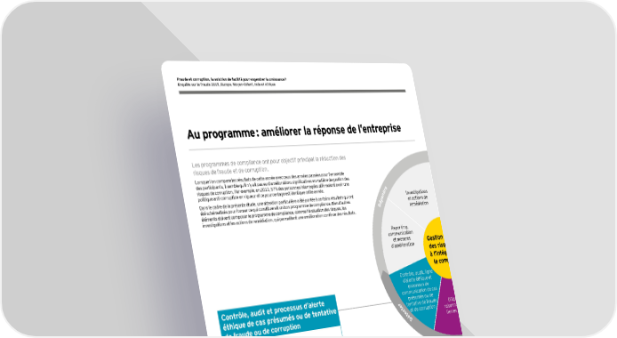 16 Les programmes de compliance ont pour objectif principal la réduction des risques de fraude et de corruption. Lorsque l’on compare les résultats de cette année avec ceux des années passées pour l’ensemble des participants, il semble qu’il n’y ait pas eu d’améliorations significatives en matière de gestion des risques de corruption. Par exemple, en 2013, 57 % des personnes interrogées affirmaient avoir une politique anti-corruption en vigueur et ce pourcentage est identique cette année. Dans le cadre de la présente étude, une attention particulière a été portée à certains résultats qui ont été schématisés pour former ce qui constituerait un bon programme de compliance. Bien d’autres éléments doivent composer le programme de compliance, comme l’évaluation des risques, les investigations et les actions de remédiation, qui permettent une amélioration continue des résultats. Surveillance Le contrôle est un élément clé des programmes d’intégrité et de compliance robustes. Il est cependant impossible en pratique de surveiller toutes les activités et transactions de l’entreprise. Il est donc primordial de décider quelles activités à haut risque doivent être surveillées et de revoir régulièrement la liste de ces activités. Trop souvent, la surveillance n’est pas aussi efficace qu’elle pourrait l’être. Elle est parfois constituée d’une série de tests des programmes et des procédures existants basés sur des règles relativement simples. Les tests plus ciblés et intelligents vont au-delà des politiques de compliance pour contrôler dans quelle mesure les opérations développées par les filiales respectent l’esprit de la politique générale de l’entreprise. Cette approche aide les entreprises à identifier les risques émergents, les tendances et les différentes perceptions en matière de compliance. Rapports confidentiels et lancement d’alertes Avoir une ligne d’alerte éthique devient obligatoire pour l’entreprise. Les autorités de régulation considèrent cet outil de communication comme une composante essentielle d’un programme de compliance. Sans cette ligne d’alerte, sans directives claires ou sans soutien de la direction, les collaborateurs peuvent hésiter à communiquer les cas de fraudes ou autres pratiques non éthiques. Nos résultats suggèrent que lorsqu’elles existent, les lignes d’alerte éthiques ne sont pas toujours efficaces : 42 % des personnes interrogées dont l’entreprise possède une telle ligne estiment qu’un rapport fait toujours l’objet d’un suivi. Gérer les risques de non-conformité des tierces parties Gérer les risques liés aux tierces parties peut sembler difficile pour les entreprises internationales qui possèdent de très nombreuses relations d’affaires. Mais puisque les régimes de sanctions sont désormais de plus en plus complexes et ciblés, savoir précisément à qui vous avez affaire, y compris savoir qui sont les personnes derrière l’organisation en question, est de toute première importance pour la gestion des risques liés d’une part à la réglementation et d’autre part à la réputation. De plus en plus, la technologie est utilisée pour automatiser les processus et garantir des résultats cohérents, de la cotation des risques à la documentation des approbations. Contrôle, audit et processus d’alerte éthique de cas présumés ou de tentative de fraude ou de corruption Diligence raisonnable des tierces parties Au programme : améliorer la réponse de l’entreprise Contrôle, audit, ligne d’alerte éthique et processus de communication de cas présumés ou de tentative de fraude et de corruption Reporting, communication et mesures d’amélioration Gestion efficace des risques liés à l’intégrité et à la compliance Investigations et actions de remédiation Diligence raisonnable des tierces parties R é p o n d r e P r é v e n i r D é t e c t e r
