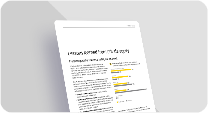 Portfolio review Lessons learned from private equity Frequency: make reviews a habit, not an event Private equity firms make portfolio reviews an ongoing How frequently do you assess your portfolio to activity, more so than their corporate peers. For example, determine business units/brands to grow or divest? more than one-quarter of PE firms carry out portfolio reviews As necessary/opportunistically quarterly, compared with just 7% of corporates; in all, nearly 33% half of PE firms conduct reviews at least twice a year as a 12% matter of course. Quarterly This PE approach should serve as a model for all enterprises, 26% particularly as the digital revolution, big data and activist 7% investors are impacting everyone’s business model and forcing Twice a year companies to review performance more often. Specifically, we 22% believe corporates should carry out three key types of reviews: 30% • In-depth portfolio review. These reviews should be Annually conducted once or twice a year. 19% 50% • Quarterly performance review. Every quarter, public Every two years companies should understand in detail performance against 1% plan, macro market dynamics and competitor actions, and accordingly, whether any changes are required to their Private equity Corporate capital allocation and structure. • Use analytics for real-time insight. Companies should use internal and external analytics to stay closer to their businesses and ideally have real-time access to meaningful Percentage of high-performing deals by frequency of granular performance data in order to make faster and portfolio review (measured by impact on valuation multiple) more precise decisions. Our survey shows a clear link between frequent portfolio Quarterly reviews and divestment success. Among the respondents 48% who experienced high-performing deals, 48% carried out As necessary/opportunistically reviews quarterly and 37% annually — a 30% difference in 38% likelihood of success. Twice a year There are other implications of infrequent portfolio reviews. 37% Shareholder activists tend to get involved when the market Annually perceives that a company does not appreciate the inherent 37% value in its portfolio of businesses and is slow to act. This is Every two years becoming a widespread problem: 78% of executives expect 29% the same or an increased number of unsolicited or hostile bids within the next year. Shareholder activism in the US • The number of activist campaigns increased by 17% between 2010 and 2014 — and 2015 is set to outpace 2014 (annualized 644 campaigns in 2015 versus 518 in 2014). • Divestments are the second most frequent change activists are pushing, behind governance — which can also result in a divestment. • Technology, consumer products and retail, and life sciences have been the most targeted sectors over the last five years (455, 322 and 265, respectively). Source: Shark Repellent and EY data analysis. 11