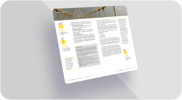 12 There’s no reward without risk — EY’s global governance, risk and compliance survey 2015 | 13 Advance | Optimize | Embed Advance | Optimize | Embed Optimization of functions and processes helps organizations establish a structure in which it can efficiently and effectively execute its risk strategy. The appropriate operating model, talent, skillsets, and risk management policies and processes enable the smooth execution of risk response activities; making it easier to embed solutions as part of the fabric of the organization. 2. Aligning the right talent and skillsets Once an organization has assigned clear ownership and accountability for risk response activities, it needs to then align the resources and skillsets required to execute those activities. This is usually straightforward in the first line of defense, but may be more complex in the second and third line. Leading organizations demand talent with deep industry and business knowledge, as well as skills relevant to each of the risk categories — strategic, preventable and external. Recognizing the upside potential of strategic risks and the need to limit the potential impact of external risks, these organizations are developing and aligning talent with the requisite skillsets across each of the three lines of defense to improve the effectiveness and efficiency of each, better enabling the organization to execute its risk strategy. Respondents identified the following as the most important skills or experiences required to enhance their risk functions: 1. Risk management 2. Business strategy 3. Critical/analytical thinking 4. Regulatory compliance 5. Process improvement As an example, resources with a background in business continuity planning or disaster recovery (DR) have typically resided within the first line of defense, but leading organizations are now embedding resources with similar backgrounds within the first and second lines of defense to facilitate and monitor the response related to external risks. Similarly, launching a new social media platform requires resources with digital expertise within each line of defense; this enables each line to better understand the associated strategic risks and appropriately balance risk mitigation activities with the benefits. 3. Designing risk management policies and processes Lastly, an organization must design policies and processes governing the execution of its risk response plans. Risk management policies and processes are integral to influencing behaviors, coordinating activities, establishing communication protocols and facilitating risk reporting — they dictate why to do it , what to do and when to do it . To illustrate, an organization facing external risks arising from competitor strategic shifts might design processes to facilitate wargaming exercises across the three lines of defense to evaluate the potential impact to the company’s business strategy. These processes would help to define each function’s role and responsibilities, the frequency at which the exercises are conducted, and how the results are to be compiled and communicated to decision-makers. 65% of respondents do not produce a report, or only prepare an integrated risk management report annually. The “three lines of defense” need to be identified and deployed as part of the organization’s risk strategy. However, no line of defense executes this strategy single- handedly, they must work in concert. EY defines three lines of defense as follows: • First line (operations and business units) This group comprises of the line management responsible for identifying and managing risks directly (design and operational controls); they regard risk management as a crucial element of their everyday jobs. • Second line (management assurance) This group (typically covering risk management, internal controls, SOX, legal, compliance, etc.) is responsible for the ongoing monitoring of the design and operation of controls in the first line of defense, as well as advising and facilitating risk management activities. • Third line (independent assurance) This group is responsible for independent assurance over risk management activities — it will include the Internal Audit function, external auditors and applicable regulators. The organization’s management should be responsible for mapping and assigning clear ownership and accountability for risk response activities across the three lines of defense. This establishes a structure to facilitate coordination, communication and reporting across clear boundaries of responsibility; it also enables an organization to validate risk coverage and foster a culture in which all parties understand their role in executing the organization’s risk strategy. Defining a risk culture Risk culture is reflected in the behaviors and actions of people. It is the belief system, or set of values within an organization that make risk an integral part of the business and supports the achievement of the organization’s overall purpose. Regulators address risk culture through factors affecting risk-taking behavior such as risk appetite, governance and compensation. To deliver an appropriate risk culture, a variety of mechanisms need to be in place and be effective. When in place and effective, the mechanisms contribute to deliver the desired behavior outcomes. Attributes of a sound risk culture: • Leadership: Tone from the middle tier of management is aligned with tone from the top tier to establish desired risk behaviors. • Organization: Governance and business models support the delivery of desired risk behaviors and enable strong accountability and effective challenge. • Risk framework: Risk management framework is embedded in the way the business manages risk and enables effective challenge. • Incentives: Employee life cycle and incentives support the delivery of desired risk management behaviors. Survey respondents overwhelmingly recognized the need for the thre