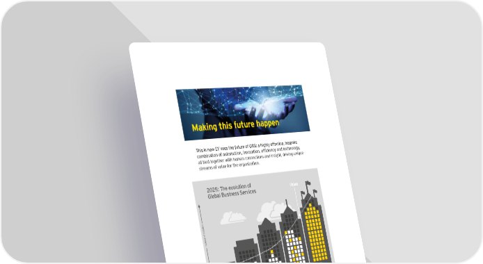 Making this future happen This is how EY sees the future of GBS: a highly effective, bespoke combination of automation, innovation, efficiency and technology, all tied together with human connections and insight, driving unique streams of value for the organization. 2025: The evolution of Value Global Business Services s er t f adap Number o Shared Multifunction Global Intelligent Global Value Services Shared Business Business Organization Services Services Solutions 2025 Single Multi Value-adding Consolidated, Global scale, function, labor function services integrated and regional agility arbitrage and innovative digital Globally integrated cost saving Internal Strategic technologies business services partner entity optimizing end-to-end and solutions processes globally SS_Dublin_infographic.indd 7 23/05/2016 12:39:19