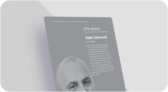 16 | Akl`]^mlmj]g^ÕfYf[]f]ol][`fgdg_qgjf]oh]ghd]7Hj]hYjaf_^gjl`]^mlmj]ÕfYf[]^mf[lagf CFO stories Zlatko Todorcevski CFO, Brambles “ Building rapport with people is absolutely critical today, and will probably become more critical, particularly if you think about the diversity of where we go and who we deal with. Thinking through how we give those skills to people is critical. I’m concerned that today we don’t necessarily have those skills at the mid-level of our finance organization. I’m not writing that level off, but in terms of what we need in the next 10 to 15 years, we probably need to focus on building better people skills with the younger people, right at the outset of their careers.”