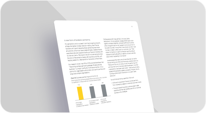 21 9f]o^gjeg^Zmkaf]kkhYjlf]jaf_ Finding people with these abilities is not easy. Zlatko If organizations are to succeed in turning increasing amounts Todorcevski, CFO at Australian-headquartered supply chain of data into better strategic decision-making, then finance logistics company Brambles, believes that finance functions functions will have to make business partnering even more often struggle to get the right people to serve as partners to of a priority. CFOs must have a team of highly credible finance the wider business. He says that those chosen are often more executives who are capable of acting as finance’s interface with inclined, or better suited, to act in a controller role: “Their its internal clients. This team’s role will include helping to align natural inclination is to get into financial reporting without the work of the analytics teams with business priorities, and necessarily having the ability or desire to sit back and think helping leaders to understand the implications of their data. about what’s happening in the market.” Our research shows that 67% of CFOs worldwide believe that He also argues that many who do have the right skill set for “improving business partnering between finance and the the partnering role often find themselves unable to take it on. business” is a major priority for the finance function. It is a “Because of the lack of clarity around [the partnering role] — priority for organizations of all sizes, but a particular focus for and how their [own] roles have been developed or how their large and complex organizations. organizations have been constructed — they’re actually being tasked with developing statutory accounts, filing tax returns, ;`Yjl-2Business partnering a priority for all running a whole bunch of analysis on a country basis Improving business partnering between finance and business units or functions and so on.” is a significant or critical priority for tomorrow’s finance function To build that partnering capability, CFOs must: 71% 64% 68% • Shift what is expected of finance business partners, from challenging budgets to challenging business models • Find and reward those who combine subject matter expertise with the right abilities and skills to challenge business units’ strategies CFO at large CFO at medium-sized CFO at small organizations organizations organizations (>US$5b annual revenue) (>US$500m-US$5b) (US$100m–US$500m) ey.com/dnaofthecfo