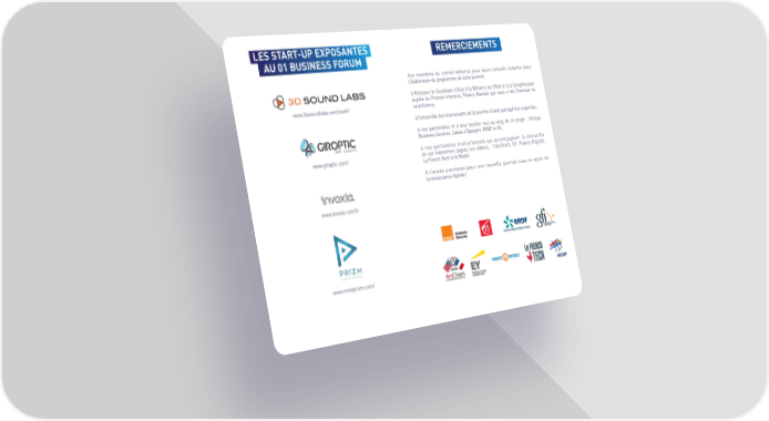 LES START-UP EXPOSANTES REMERCIEMENTS AU 01 BUSINESS FORUM šux membres du comité éditorial pour leurs conseils éclairés dans l’élaboration du programme de cette •ournée, à Monsieur le ecrétaire d’”tat à la éŠorme de l’”tat et à la implification auprès du Premier ministre, Thierr‰ Mandon …ui nous a Šait l’honneur de ²²²€¡dsoundlabs€comŸneohŸ sa présence, à l’ensemble des intervenants de la •ournée d’avoir partagé leur expertise, à nos partenaires et à leur soutien tout au long de ce pro•et Ž ¤range usiness ervices, ‚aisse d’”pargne, ”D et ®fi, à nos partenaires institutionnels …ui accompagnent la démarche ²²²€giroptic€comŸ de cet événement depuis ses débuts Ž l’šm‚ham, ”», rance Digitale, ˆa rench Tech et le MedeŠ€ š l’année prochaine pour une nouvelle •ournée sous le signe de la renaissance digitale  ²²²€invoxia€comŸŠr ²²²€meetpri‡m€comŸ