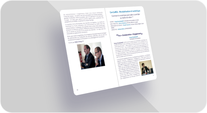 du consommateur€ ˆ’expérience client s’en trouve améliorée Cercle#04 : Mondialisation et numérique à tous les niveaux Ž en amont, lors de la conception de nouveaux produits ˜ pendant l’utilisation même du produit, pour en optimiser et en sécuriser Comment le numérique peut aider à contrôler l’usage ˜ en aval, pour gérer le service après‘vente, améliorer les sa chaîne de valeur ? programmes de fidélité, ou prévenir le vol par exemple€ ˆa …uestion de la sécurisation des données est légitime€ ˆa crainte du ”¸P”T Ž Serge Soudoplatoff, Cofondateur de Scanderia et auteur mouchard ou d’une utilisation mal intentionnée est réelle che‡ les ”T Pš‚T™‚” Ž Olivier Delabroy, Directeur R&D, Air Liquide consommateurs€ ˆ’utilisation des données doit se Šaire à bon escient pour instaurer un climat de confiance€ DiŠŠérents niveaux de sécurité devront être PÉ™D”NT D” ÉšN‚” Ž Claude Imauven, Directeur Général Adjoint, Saint- mis en œuvre en Šonction de la criticité des données Ž un en•eu dont les Gobain industriels ont pleinement conscience€ šN™MÉ Pš Ž Anthony Morel, BFM BUSINESS ”nfin, pour rester compétitives, les entreprises Šrançaises devront envisager des partenariats sur l’utilisation des données collectées, afin de créer un environnement propice à l’innovation et au développement de produits€ Fun + Collaboration + Engagement ‚onclu par Cédric Foray, EY Serge Soudoplatoff, Cofondateur de Scanderia Serge Soudoplato……, estime …ue le succès de la révolution numéri…ue est conditionné par le bon échange d’inŠormations, et la conŠiance en la communauté online Ž « Nous passons d’une économie de stocžs à une économie de Šlux »€ ¥ne tendance …ui touche plus particulièrement le concept même d’innovation, …ui est appelée à évoluer avec le développement de modèles communautaires, comme le « co-design », ou les s‰stèmes d’ « open innovation »€ ˆego a ainsi lancé une plateŠorme de co‘design pour ses prochains modèles, avec un reversement de revenu pour les internautes dont les pro•ets auront été retenus€ ˆa renaissance digitale permet de « reconfigurer les entreprises »€ « ˆe tript‰…ue gagnant, c’est un ¾ ‚ollaboration ¾ ”ngagement »€ « un » pour le •eu, un support …ui Šacilite les échanges et l’intégration des inŠormations, notamment pour appréhender un contexte mouvant lié au digital€ ˆa « collaboration » doit passer entre autres par des échanges intergénérationnels pour mélanger transmission d’expérience et culture digitale€ ”lle peut prendre la Šorme de reverse mentoring par les •eunes générations, comme che‡ ®D ue‡ ou la création de communautés online€ ”nfin, « l’engagement » des collaborateurs est vital pour réussir la ¡ ¡