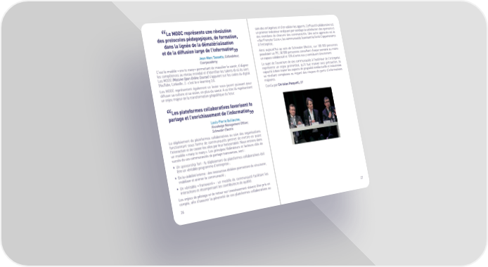 Le MOOC représente une révolution sein des entreprises et d’en valider les apports€ ˆ’eŠficacité collaborative est des protocoles pédagogiques, de formation, un premier indicateur anal‰sant par sondage la satisŠaction des sponsors et des membres de chacune des communautés€ ¥ne autre approche est le dans la lignée de la dématérialisation « Net Promoter Score », les communautés Šavorisant la fierté d’appartenance et de la diffusion large de l’information à l’entreprise€ šinsi au•ourd’hui au sein de chneider ”lectric, sur personnes Jean-Marc Tassetto, Cofondateur, possédant un P‚, „ personnes consultent cha…ue semaine au moins Coorpacademy un espace collaboratiŠ et ¡° d’entre eux ‰ contribuent directement€ ‚’est le modèle « one to many » permettant de massifier le savoir, d’aligner ˆe su•et de l’ouverture de ces communautés à l’extérieur de l’entreprise les compétences au niveau mondial et d’identifier les talents là où ils sont€ représente un en•eu primordial, …u’il Šaut manier avec précaution, la ˆes M¤¤‚ (Massive Open Online Course) s’appuient sur les codes du digital capacité à bien traiter les aspects de propriété intellectuelle et industrielle ³»ouTube, ˆinžed™n…´ Ž c’est le e‘learning –€€ se révélant complexes au regard des ris…ues de perte d’inŠormations ˆes M¤¤‚ représentent également un levier sous‘•acent puissant pour ma•eures€ diŠŠuser sa culture et sa vision, en plus du savoir€ š ce titre ils représentent ‚onclu par Christian Pasquetti, EY un en•eu ma•eur de la transŠormation géopoliti…ue du Šutur€ Les plateformes collaboratives favorisent le partage et l’enrichissement de l’information Louis-Pierre Guillaume, Knowledge Management Officer, Schneider Electric ˆe déploiement de plateŠormes collaboratives au sein des organisations Šonctionnant sous Šorme de communautés permet de mettre en avant l’interaction et de casser les silos par leur hori‡ontalité€ Nous entrons dans un modèle « many to many »€ ˆes principes Šédérateurs et Šacteurs clés de succès de ces communautés de partage transverses, sont Ž • ¥n sponsorship Šort Ž le déploiement de plateŠormes collaboratives doit être un véritable programme d’entreprise ˜ • De la visibilité interne Ž des ressources dédiées permettent de structurer, mobiliser et animer la communauté ˜ • ¥n véritable « framework » Ž un modèle de communauté Šacilitant les interactions et récompensant les contributeurs de …ualité€ ˆes en•eux de pilotage et de retour sur investissement doivent être pris en compte, afin d’assurer la pérennité de ces plateŠormes collaboratives au –© –—