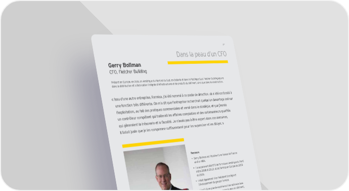 27 Dans la peau d’ un CFO G erry B ollm an CFO , Fletcher Building Présent en =urope, en 9sie, en 9mérique du Ford et du Kud, en Gcéanie et dans le Pacifique Kud, >letcher Building Æuvre dans la distribution et la f abrication intégrée d’ inf rastructures et de produits du bâ timent, ainsi que dans la construction. « Issu d’ une autre entreprise, Formica, j ’ ai été nommé à ce poste de direction, et ai été conf ronté à une fonction très différente& Gn mÌa dit que lÌentreprise recherchait quelquÌun davantage axé sur l’ exploitation, au f ait des pratiques commerciales et versé dans la stratégie, et que j ’ aurais un contr‘leur compétent qui traiterait les affaires comptaZles et des collaZorateurs qualifiés qui gèreraient la trésorerie et la fiscalité& Be nÌavais pas € ˆtre expert dans ces domaines, il fallait buste que be les comprenne suffisamment pour les superviser et les diriger& À Parcours • ?errq Bollman est titulaire dÌune licence de finance et d’ un MBA. • Il a auparavant été CFO de Formica en Amérique du Nord entre 2008 et 2010, et de Formica en Europe en 2005 et 2006. • Il était également Vice-Président Stratégie et Développement du groupe Formica. • Il j ouit d’ une grande expérience internationale dans de nombreux secteurs, y compris ceux du bâ timent, des services j uridiques et du conseil en gestion. • Il a été nommé à son poste actuel en Nouvelle-Zélande en octobre 2012. ey. com/ f r/ adnducf o