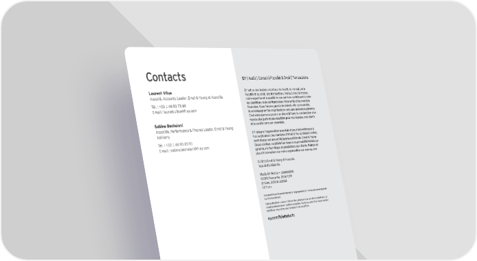 C on tac ts E Y | Audit | Conseil | Fiscalité & Droit | Transactions Laurent Vitse EY est un des leaders mondiaux de l’audit, du conseil, de la Associé, Accounts L eader, Ernst & Y oung et Associés f iscalité et du droit, des transactions. Partout dans le monde, notre expertise et la qualité de nos services contribuent à créer Tél. : + 33 1 46 93 75 69 les conditions de la conf iance dans l’ économie et les marchés E-mail : laurent. vitse@ f r. ey. com f inanciers. Nous f aisons grandir les talents af in qu’ ensemble, ils accompagnent les organisations vers une croissance pérenne. C’ est ainsi que nous j ouons un rô le actif dans la construction d’ un S ab ine B ech elani monde plus j uste et plus équilibré pour nos équipes, nos clients Associée, Perf ormance & Finance L eader, Ernst & Y oung et la société dans son ensemble. Advisory EY désigne l’ organisation mondiale et peut f aire réf érence à Tél. : + 33 1 46 93 85 91 l’ un ou plusieurs des membres d’ Ernst & Y oung Global L imited, dont chacun est une entité j uridique distincte. Ernst & Y oung E-mail : sabine. bechelani@ f r. ey. com Global L imited, société britannique à responsabilité limitée par garantie, ne f ournit pas de prestations aux clients. Retrouvez plus d’ inf ormations sur notre organisation sur w w w . ey. com. © 2016 Ernst & Y oung et Associés. Tous droits réservés. Studio EY France — 1606SG830 SCO RE France No. 2016-029 EY G no. 00978-163Gbl ED None Document imprimé conf ormément à l’engagement d’ EY de réduire son empreinte sur l’ environnement. Cette publication a valeur d’ inf ormation générale et ne saurait se substituer à un conseil professionnel en matière comptaZle, fiscale ou autre& Pour toute question spécif ique, vous devez vous adresser à vos conseillers. e y . c om / f r / ad n d u c f o