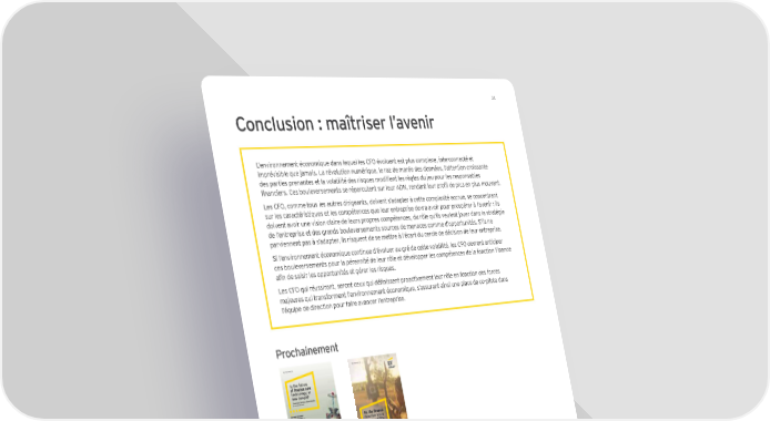 31 Conclusion : maîtriser l’avenir L’environnement économique dans lequel les CFO évoluent est plus complexe, interconnecté et imprévisible que jamais. La révolution numérique, le raz de marée des données, l’attention croissante des parties prenantes et la volatilité des risques modifient les règles du jeu pour les responsables financiers. Ces bouleversements se répercutent sur leur ADN, rendant leur profil de plus en plus mouvant. Les CFO, comme tous les autres dirigeants, doivent s’adapter à cette complexité accrue, se concentrant sur les caractéristiques et les compétences que leur entreprise devra avoir pour prospérer à l’avenir : ils doivent avoir une vision claire de leurs propres compétences, du rôle qu’ils veulent jouer dans la stratégie de l’entreprise et des grands bouleversements sources de menaces comme d’opportunités. S’ils ne parviennent pas à s’adapter, ils risquent de se mettre à l’écart du cercle de décision de leur entreprise. Si l’environnement économique continue d’évoluer au gré de cette volatilité, les CFO devront anticiper ces bouleversements pour la pérennité de leur rôle et développer les compétences de la fonction Finance afin de saisir les opportunités et gérer les risques. Les CFO qui réussiront, seront ceux qui définissent proactivement leur rôle en fonction des forces majeures qui transforment l’environnement économique, s’assurant ainsi une place de co-pilote dans l’équipe de direction pour faire avancer l’entreprise. Prochainement The DNA of the CFO The DNA of the CFO Is the future technology or new people? ey.com/dnaofthecfo function blurs, how can CFOs Becoming the CFO your organization will need tomorrow ey.com/dnaofthecfo Autres publications Série Partnering for performance : Part 1 : Part 2 : Part 3 : Part 4 : the CFO and the Chief Part 5 : the CFO and the chief The CFO and the supply chain The CFO and HR the CFO and the CIO marketing officer executive officer Pour enrichir votre point de vue, consultez ey.com/fr/adnducfo ey.com/fr/adnducfo