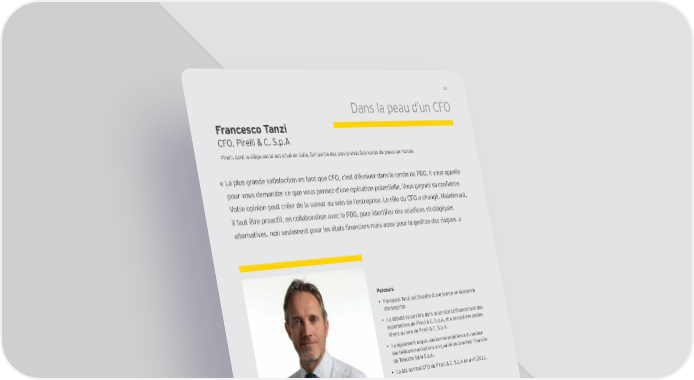 1 5 Dans la peau d’ un CFO Francesco Tanz i CFO , Pirelli & C. S. p. A Pirelli, dont le siège social est situé en Atalie, fait partie des plus grands faZricants de pneus au monde& « L a plus grande satisf action en tant que CFO , c’ est d’ évoluer dans le cercle du PDG. Il vous appelle pour vous demander ce que vous penser dÌune opération potentielle& Nous gagner sa confiance& Votre opinion peut créer de la valeur au sein de l’entreprise. L e rô le du CFO a changé. Maintenant, il faut ˆtre proactif, en collaZoration avec le P
