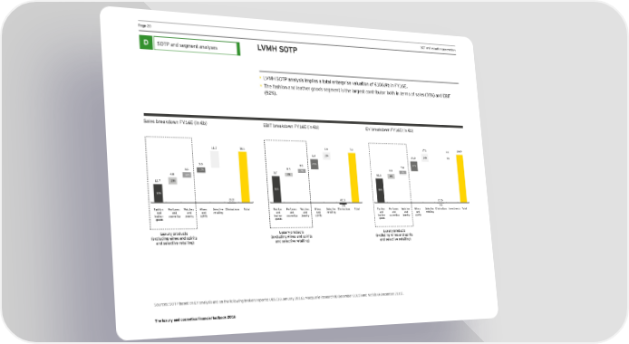 Ha_e *( DCF and valuation parameters D SOTP and segment analyses LVMH SOTP • DNE@ KGLH analqsis implies a total enterprise nalmation of Ò)(..1b in >Y).E. • The fashion and leather goods segment is the largest contributor both in terms of sales (35%) and EBIT (52%). Kales Zjeacdgon >Q).= in ÒZ! =:AL Zjeacdgon >Q).= in ÒZ! =N Zjeacdgon >Q).= in ÒZ! 1.0 7.0 17.2 0.0 106.9 11.7 36.1 1.4 15% 21.9 16% 0% 31% 3.6 0.5 20% 7.6 20% 3.5 13% 0.5 7% 13% 9.9 7% 13% 10% 3.7 4.8 10% 8% 51.5 9% 9% 13% 12.7 13% 52% 48% 35% (0.3) (0.1) (1.3) -2% -1% Fashion Perfumes Watches Wines Selective Eliminations Total Fashion Perfumes Watches Wines Selective Eliminations Total Fashion Perfumes Watches Wines Selective Eliminations Investments Total and and and and retailing and and and and retailing and and and and retailing leather cosmetics jewelry spirits leather cosmetics jewelry spirits leather cosmetics jewelry spirits goods goods goods Luxury products Luxury products Luxury products (excluding wines and spirits (excluding wines and spirits (excluding wines and spirits and selective retailing) and selective retailing) and selective retailing) Komrces2 KGLH based on EY analqsis and on the follooing brocers reports2 M:K )0 Banmarq *().!, Eacimarie Jesearch 0