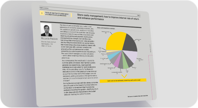 DCF and vIndustry oaluation pverview arameters PPage 67age 67 I Points of view from EY global sector Store costs management: how to improve internal rate of return and other industry professionals and enhance performance The internet and social media have created a new Store cost breakdown: example generation of constantly connected consumers, who are updated on global trends, sensitive to innovation General construction and willing to share with the world their own shopping 31% experience. Even the way we think about stores and what they should be (and generally retail business Wooden Items Riccardo Pastore management) has changed. Eye-catching signs, 20% furnishings that enhance products’ value perception w Director, Cost and Cash and stunning showcases remain key success factors, Optimization, TAS but modern shops should also be able to interact with ervie v Milan, EY S.p.A. social media and with customers’ smartphones, Other try o proposing offers and personalized content, 1% presenting innovative experiences and responding to Carpets Indus 1% the needs of both teenagers and older consumers Painting — all this while remaining a friendly and enjoyable 3% place to go. Lift and stairs Shelves 4% and furniture As a conseimence, the onerall cost of a store’s life 12% cycle has greatly increased. New high-tech systems Demolition and strip out generate neo expenditmres, reimire periodic 5% maintenance and are subject to rapid obsolescence Electrical works Markup risks. At the same time, costs for furniture and 5% 7% renovations (which in the opening of a new store can Stones account for more than 60% of the budget) have not External windows and doors 6% 5% decreased, putting companies on the spot to make a decision: increase the budget or just say no to certain changes? Each cost can be addressed, preserving quality and concept During the store concept definition phase, companies are so focused on the impact of communication and on the return on investment that the store may postpone ansoering this imestion, identifqing onlq in a later stage solutions that adhere to the budget while still realizing the spirit of the store. The luxury and cosmetics financial factbook 2016