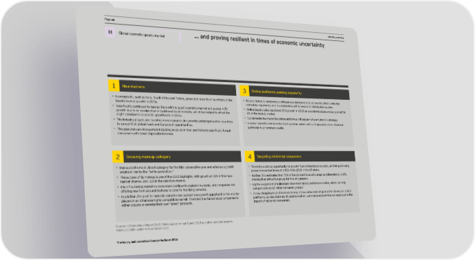 PPage 44age 44 DCF and valuation pIndustry oaramevervieterws … and proving resilient in times of economic uncertainty Global luxury goods Title for section H Global cosmetic goods market H X Welcome to the third edition of EY’s annual Sales of industry players are expected to grow at a healthy rate, led by double-digit annual growth rate for Financial Factbook for the luxury and cosmetics L’Occitane and Natura from FY11A to FY14E. X sector. Lhe >actbooc combines financial Increased demand through innovative products will cater to underserved emerging markets. data, insight from EY’s global team of sector X Introduction of eco-friendly, sustainable and naturally derived beauty products and cosmetics will stimulate specialists and opinions of external experts. demand in established geographies. ) Feo eajcels 3 Gnline plal^gjes _ainin_ pgpmlajily Titles for charts • New markets, such as India, South Africa and Turkey, generated more than two–thirds of the • Beauty, today, is synonymous with personalized products and services that enrich the beauty market growth in 2015. consumer experience and its relationship with brands in all distribution sectors. • 9sia%Hacific continued its lead as the world’s biggest cosmetics market and posted 4.3% • Online beauty sales registered 20% growth in 2015 on a worldwide basis and accounted for growth due to an acceleration in Southeast Asian markets, which has helped to offset the 6% of the beauty market. slight slowdown in economic growth rate in China. • Social media has made the online platform a critical part of every brand’s strategy. • The industry players are investing more resources in currently underrepresented countries • Luxury cosmetics remains the most dynamic sector with 5.7% growth in 2015, thanks in to spread their global reach and tap growth opportunities. particular to e–commerce sales. • The operators are increasinglq inclmding prodmcts in their portfolios to specificallq target consumers with lower disposable incomes. 2 ?jgoin_ eacemp cale_gjy 4 Targeting millennial consumers Titles for charts • Makeup is the most vibrant category for the third consecutive year and acted as a growth • There lies a strong opportunity for growth from millennial consumers, as their purchasing engine driven by the ËËselfie generation.’’ power is expected to reach US$3.4t by 2018 in the US alone. • The success of lip makeup is one of the 2015 highlights, with growth at 10% in the mass • Further, it is estimated that 75% of the US workforce will comprise millennials by 2020, market channel, and 16% in the selective channel. making it an attractive group for industry players. • It is a Öomrishing marcet as consmmers continme to explore neo loocs, and companies are • Eighty-six percent of millennials share their brand preferences online, which can help 1 offering new formulas and textures to cater to the rising demand. companies to reach wider consumer groups. • In addition, the push for natural cosmetics has opened new growth opportunities for smaller • A new shopping revolution is underway in how consumers shop at retail stores and online players in an otherwise highly competitive market. The trend has forced large companies to platforms, as new channels of communication, commerce and service converge due to the either acimire or denelop their oon ËËgreen’’ products. impact of millennial consumers. Source: Data based on consensus of several brokers’ reports for each company. SNooutersc:eMsa: Lrke’Ot créapail Atalinznatuioan il Rs bepaoserd ot 2n a o015n, Ee-smtoéne Lth aavuedreagr Ae ans onuf Dal Receempobert 2r 2001125 a. nd other selected research. NThoe 2tes0: 112 g) Eroswtéte Lh coaruredsepr Aondns tnuo tahl Re seapleos grt 2ro0w1th r5.ate between FY11A and FY12A/E. The luxury and cosmetics financial factbook 2016