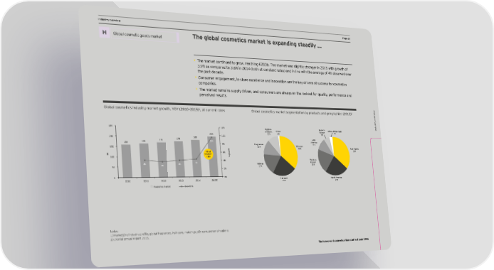 DCF and vIndustry oaluation pverview arameters PPage 43age 43 Ex ec The global cosmetics market is expanding steadily … utiv Global luxury goods Title for section H Global cosmetic goods market e summary H X Welcome to the third edition of EY’s annual • TShae mles oaf irknedt cuostnrty pinulaeyd tero gs arroe ew, rxpeeacctheid tng €o g2r0o3w ab. Tt a hhe meaaltrhky ret wataes s, lelid bghty dly soturbolneg-deir igin 2t an0n1u5 wal gitrh gowrth rowath ote ffo r Financial Factbook for the luxury and cosmetics 3L’.O9% accits canoe ampnad Nred tatuo 3ra f.6ro% im Fn 2Y01114 (A tbo Foth aY1t c4Eo. nstant rates) and in line with the average of 4% observed over DCF and v p the past decade. ar X Increased demand through innovative products will cater to underserved emerging markets. sector. Lhe >actbooc combines financial • Consumer engagement, in-store excellence and innovation are the key drivers of success for cosmetics ame data, insight from EY’s global team of sector X aluation Introduction of eco-friendly, sustainable and naturally derived beauty products and cosmetics will stimulate t er specialists and opinions of external experts. companies. s demand in established geographies. • Lhe marcet remains smpplq drinen, and consmmers are aloaqs on the loocomt for imalitq, performance and Titles for charts perceived results. Indusw ) 2 ?lgZal cgseelics indmsljy eajcel _jgol`$ QGQ *()(Ç*()-! , at current rates ?lgZal cgseelics eajcel se_eenlalign Zy pjgdmcls and _eg_jap`ies *()-! try oervie v v ervietry o w Indus 250 12% Hygiene Other Eastern Africa, Middle East products 1% Europe 3% 203 11% 6% 200 185 10% 171 178 Latin 158 165 10% America 8% Fragrances 11% 150 12% Skin care Asia-Pacific and disMe 36% b +4% at 6% owth 36% thodology € constant gr claimer 100 rate % 4% Western 4% Europe 4% 4% 4% Makeup 20% 50 17% Titles for charts 2% 0 0% Hair care North America 2010 2011 2012 2013 2014 2015E 23% 24% and specific analyS Cosmetics market Growth % ample s election s e s Source: Data based on consensus of several brokers’ reports for each C Glo company. on Notes: t s act uss N)! Eotesa:rMceartkDeit cne iapnitdamlizsattriq pon irs bofialsee, gd olon a obal fner-amgornatnh acevse, hragae air cs oarf De, meceamcebeÈr 2mp0, s12c.i n care, personal hqgiene. ary The 2012 growth corresponds to the sales growth rate between FY11A and FY12A/E. 2) L’Oréal annual report 2015. The luxury and cosmetics financial factbook 2016