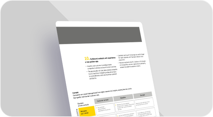 10 . O utb ound contacts w ill ex p erience • Customer scoring will increasingly be used to target the right customers with the most relevant value a new golden age. proposition. • Analytics and customer knowledge enable • Personal assistants (like Siri, Cortana or OK Google) companies to develop outbound contact practices. will change the customer relationship by delivering answers to customer questions directly. • The accumulation of client data enables companies to act proactively, instigating outbound contacts to avoid additional costs and maximize customer satisfaction. Ex amp le: Companies can convert data gathered from digital channels into insights, enab ling them to provide high- q uality multichannel customer care. Example Customer context O b j ective Example of new contacts g n ►The customer ► W elcome the new customer ti W elcome just purchased / to the service / company and provide W elcome email w ith tips on how s i sub scrib ed to the service him/her w ith useful information to fine tune service options x call / email E and tips. Closed- loop ►The customer ► G et fast feedb ack from customers Email asking to rate the level feedb ack w as in contact ( N P S ), w hatever the touchpoint of recommendation follow ing call / email w ith the company and the channel used the latest call to customer care P roactive ►The customer stopped ► U nderstand w hy the customer “ W e noticed y ou did not complete stimulus in the middle of a process stopped the process and try y our sub scription. Can w e help? ” call / email (eg. sub scription process) to get her / him to complete it ►The customer show ed ► Try to have the customer The user clicks on a sponsored Facebook P roactive strong interest in a product purchase the product / service post for a service from the operator, sales call / service that he /she w as interested in then receives a free trial offer by email for this service s t “W e noticed y our phone is still n ►The customer b row sed ► P ush relevant and useful oi P roactive technical assistance pages technical assistance solutions not active on our netw ork although p y ou looked at our support pages. t technical to the user ac assistance ►Connected device signals Y ou can contact us this w ay or go t assistance need to this store” n e o c v ti e ► ► v P roactive The customer’ s technical Create a file for the user’s “We have created a technical file ec ti issue seems genuine proactively identified issue, for y ou so that every thing is ready p technical s ac (no need for user confirmation) “t emporary ” until activated w hen y ou get in touch w ith o o file creation r r b y the user contacting the company our support team” P P Sources: EY Analysis 12 O ff- site Customer R elationship S tudy | J anuary 2 016