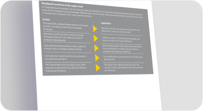 Misaligned incentives in the supply chain An integrated planning model that links finance, sales and operations in a transparent and accountable way helps to overcome some of the misaligned incentives between different parts of the business . Below are some examples of actions that can result in misalignment, along with their unfortunate implications: Action Implication The sales team underestimates demand in forecasts Operations plan for less capacity and, when the real so that it can demonstrate that it has beaten demand hits, they are unable to meet it . its targets . Operations pushes as many products through Inventory builds up, increasing working capital and the supply chain as it can reduce unit cost of reducing visibility and overall efficiency. products manufactured . Sales and marketing maintain a high number of Servicing the product lines, some of which are likely product lines to increase customer choice . to be unprofitable, increases cost and inventory complexity and reduces profitability. Cost-reduction incentives drive procurement to Poor-quality parts cause problems in manufacturing purchase low-cost parts. when they fail . The finance team puts the supply chain under The supply chain reduces production and trims pressure to reduce working capital to improve inventory levels, which leads to stock-outs and poor financial performance. service levels . Partnering for performance Part 1: the CFO and the supply chain 23