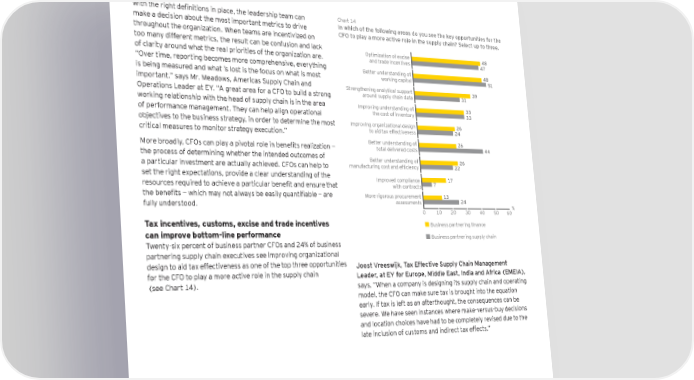 With the right definitions in place, the leadership team can Chart 14 make a decision about the most important metrics to drive In which of the following areas do you see the key opportunities for the throughout the organization . When teams are incentivized on CFO to play a more active role in the supply chain? Select up to three. too many different metrics, the result can be confusion and lack Optimization of excise 48 of clarity around what the real priorities of the organization are . and trade incentives 47 “Over time, reporting becomes more comprehensive, everything Better understanding of 48 is being measured and what is lost is the focus on what is most working capital 51 important .” says Mr . Meadows, Americas Supply Chain and Strengthening analytical support 39 Operations Leader at EY . “A great area for a CFO to build a strong around supply chain data 31 working relationship with the head of supply chain is in the area Improving understanding of 33 of performance management . They can help align operational the cost of inventory 33 objectives to the business strategy, in order to determine the most Improving organizational design 26 critical measures to monitor strategy execution .” to aid tax effectiveness 24 Better understanding of 26 More broadly, CFOs can play a pivotal role in benefits realization — total delivered costs 44 the process of determining whether the intended outcomes of Better understanding of 26 a particular investment are actually achieved . CFOs can help to manufacturing cost and efficiency 22 set the right expectations, provide a clear understanding of the Improved compliance 17 resources required to achieve a particular benefit and ensure that with contracts 7 the benefits — which may not always be easily quantifiable — are curement More rigorous pro 13 fully understood . assessments 24 % 0 10 20 30 40 50 60 Tax incentives, customs, excise and trade incentives Business partnering finance can improve bottom-line performance Business partnering supply chain Twenty-six percent of business partner CFOs and 24% of business partnering supply chain executives see improving organizational design to aid tax effectiveness as one of the top three opportunities Joost Vreeswijk, Tax Effective Supply Chain Management for the CFO to play a more active role in the supply chain Leader, at EY for Europe, Middle East, India and Africa (EMEIA), (see Chart 14). says, “When a company is designing its supply chain and operating model, the CFO can make sure tax is brought into the equation early . If tax is left as an afterthought, the consequences can be severe. We have seen instances where make-versus-buy decisions and location choices have had to be completely revised due to the late inclusion of customs and indirect tax effects .” Partnering for performance Part 1: the CFO and the supply chain 27