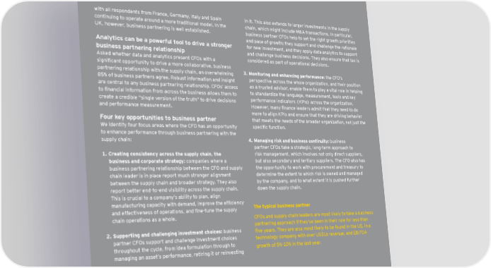 with all respondents from France, Germany, Italy and Spain in it. This also extends to larger investments in the supply continuing to operate around a more traditional model. In the chain, which might include M&A transactions. In particular, UK, however, business partnering is well established. business partner CFOs help to set the right growth priorities and pace of growth; they support and challenge the rationale Analytics can be a powerful tool to drive a stronger for new investment, and they apply data analytics to support business partnering relationship and challenge business decisions. They also ensure that tax is Asked whether data and analytics present CFOs with a considered as part of operational decisions. significant opportunity to drive a more collaborative, business partnering relationship with the supply chain, an overwhelming 3. Monitoring and enhancing performance: the CFO’s 85% of business partners agree. Robust information and insight perspective across the whole organization, and their position are central to any business partnering relationship. CFOs’ access as a trusted advisor, enable them to play a vital role in helping to financial information from across the business allows them to to standardize the language, measurement, tools and key create a credible “single version of the truth” to drive decisions performance indicators (KPIs) across the organization. and performance measurement. However, many finance leaders admit that they need to do more to align KPIs and ensure that they are driving behavior Four key opportunities to business partner that meets the needs of the broader organization, not just the We identify four focus areas where the CFO has an opportunity specific function. to enhance performance through business partnering with the supply chain: 4. Managing risk and business continuity: business partner CFOs take a strategic, long-term approach to 1. Creating consistency across the supply chain, the risk management, which involves not only direct suppliers, business and corporate strategy: companies where a but also secondary and tertiary suppliers. The CFO also has business partnering relationship between the CFO and supply the opportunity to work with procurement and treasury to chain leader is in place report much stronger alignment determine the extent to which risk is owned and managed between the supply chain and broader strategy. They also by the company, and to what extent it is pushed further report better end-to-end visibility across the supply chain. down the supply chain. This is crucial to a company’s ability to plan, align manufacturing capacity with demand, improve the efficiency and effectiveness of operations, and fine-tune the supply The typical business partner chain operations as a whole. CFOs and supply chain leaders are most likely to take a business partnering approach if they’ve been in their role for less than 2. Supporting and challenging investment choices: business five years. They are also most likely to be found in the US, in a partner CFOs support and challenge investment choices technology company with over US$1b revenue, and EBITDA throughout the cycle, from idea formulation through to growth of 5%–10% in the last year. managing an asset’s performance, retiring it or reinvesting Partnering for performance Part 1: the CFO and the supply chain 5