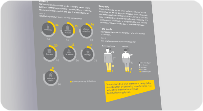 Sectors Geography Technology and consumer products tend to have a strong The countries in our survey where business partnering is most business partnering emphasis. However, in heavy industry, established are the US, Singapore and South Korea. The story in mining and metals, and oil and gas, it is less established. Western Europe is very different. In France, Germany, Spain and Chart 7 Italy, no respondents describe the relationship between the CFO What is the primary industry for your company (%)? and the supply chain leader as being one built around business partnering. This was also the case in Argentina and Russia. 20 34 33 Time in role Technology Consumer Automotive Business partners are also more likely to be relatively new products to their role. Chart 8 34 41 58 How long have you been in your current role (%)? 20 12 10 Business partnering Traditional 3 12 21 Telecoms Life sciences Oil and gas 29 46 56 74 37 40 More than 15 years 31 11–15 years 8 6–10 years 7 16 2–5 years 3 Less than 2 years Mining and metals Business partnering Traditional 76 To learn more from CFOs and heads of supply chains about how they are partnering for performance, read some of our interview transcripts at ey.com/cfoandsupplychain Partnering for performance Part 1: the CFO and the supply chain 13