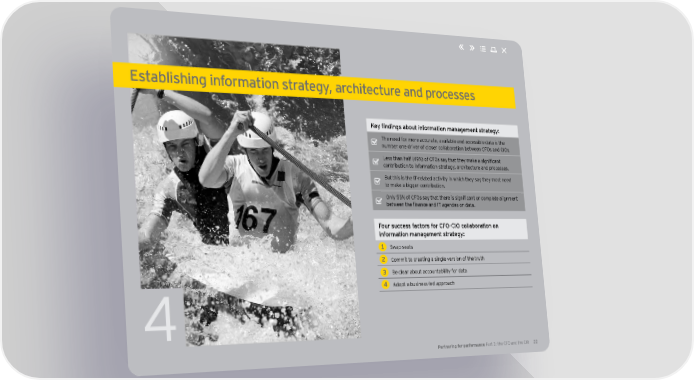 Establishing information strategy, architecture and processes Key findings about information management strategy: The need for more accurate, available and accessible data is the number one driver of closer collaboration between CFOs and CIOs. Less than half (49%) of CFOs say that they make a significant contribution to information strategy, architecture and processes. But this is the IT-related activity in which they say they most need to make a bigger contribution. Only 55% of CFOs say that there is significant or complete alignment between the finance and IT agendas on data. Four success factors for CFO-CIO collaboration on information management strategy: 1 Swap seats 2 Commit to creating a single version of the truth 3 Be clear about accountability for data 4 Adopt a business-led approach 4 Partnering for performance Part 3: the CFO and the CIO 22
