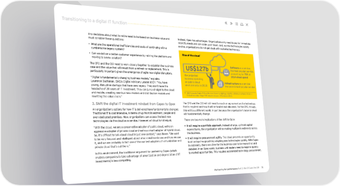 Transitioning to a digital IT function Any decisions about what to retire need to be based on business value and Instead, Opex has advantages. Organizations only need to pay for immediate must consider these questions: capacity needs and can scale up or down. And, as new technologies rapidly • What are the operational inefficiencies and costs of continuing with a evolve, organizations do not get stuck with outdated technology. cumbersome legacy system? of CFOs from technology firms Rise of the cloud5 • Can we deliver a better customer experience by retiring the platform and moving to a new solution? say they make a “very significant” contribution to the information Software as a service: management strategy, compared The CFO and the CIO need to work closely together to establish the business US$127b the most popular service, with a sector average of 16%. case and the value that will result from a refresh or replacement. This is accounting for 70% of particularly important given the emergence of agile new digital disruptors. the projected 2014 cloud spend “Digital is fundamentally changing business models,” explains business spending Laurence Buchanan, EMEIA Digital Advisory Leader at EY. “You have on public cloud Infrastructure as a service: young, disruptive startups that have zero legacy. They don’t have the environments in 2018 the second most popular service headache of 20 years of IT investment. They can jump straight to the cloud and mobile, creating new business models and distribution models and 5. “IDC Forecasts Public IT Cloud Services Spending Will Reach $127b in 2018 as the Market Enters a rewriting the value chain.” Critical Innovation Stage,”IDC website, idc.com, 3 November 2014. 3. Shift the digital IT investment mindset from Capex to Opex The CFO and the CIO will still need to reach an agreement on the technology An organization’s options for how IT is delivered have fundamentally changed. that is required and how it will be funded and allocated. For the CFO, though, Traditional IT is cost intensive, in terms of up-front investment, people and this will be a different world, in part because the organization’s balance sheet even dedicated premises. Now, organizations can access the best new will fundamentally change. technologies via the cloud as a service. However, all cloud is not equal. There are two main implications of the shift to Opex: “With the cloud, we are a conservative adopter of public cloud, we’re an • It will require a portfolio approach. Instead of large, up-front capital aggressive adopter of private cloud and we’re a smart adopter of hybrid cloud. expenditures, the organization will be making multiple investments across So, it’s difficult to talk about cloud in just one context,” says Boxer. “We want the business. to be very focused and intelligent about what cloud we do use and how we use • It will require procurement agility. The cloud presents an opportunity it, and we are probably in fact one of the earliest adopters of virtualization and to drive top-line growth by adopting new technologies quickly. With Capex private cloud that’s out there.” investments, there was time for the business case to be researched and In this environment, the traditional argument for preferring Capex (which debated. In an Opex world, business unit leaders need to respond quickly enables companies to take advantage of amortization and depreciation of IT to market opportunities. This requires accelerated technology procurement. investments) is less compelling. Partnering for performance Part 3: the CFO and the CIO 31