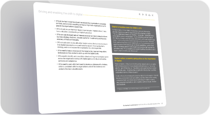 Driving and enabling the shift to digital • CFOs in low-tech industries should reevaluate the organization’s corporate portfolio, and consider acquiring startups or high-tech organizations to fill Digital is headline news for CNBC’s CFO gaps in the organization’s capabilities. For Harry Bains, CFO at CNBC, the business news and information • CFOs should ensure that their finance team includes “digital natives,” who provider, there is no question about the priority attached to digital. have a detailed understanding of digital’s potential. “For us, digital really means our revenue,” he explains. “What gets tricky • CFOs can use divergent sets of internal and external historic data to inform in the digital space is monetization. You’re competing with the scale of business strategy decisions, allocate capital for investments and improve the Yahoos, Googles and Facebooks of the world, which get massive page accuracy of financial forecasts. views. That’s really put the content providers under pressure. We know that’s both a threat but also an opportunity, so it’s an area where we’re • CFOs should work closely with other leaders across the business to ensure spending a lot of time ramping up our digital capabilities. I get involved that digital investments are coordinated to support the organization’s with our strategic plan and with ensuring we have the right approach to strategy, and do not expose the organization to unmanaged risk. get better data. The accessibility and speed of getting data offers a lot of • CFOs need to keep a close eye on the changing tax, legal and regulatory opportunity to identify cost efficiencies.” landscapes as they evolve to catch up with the digital world. • CFOs need to identify and consolidate siloed and fragmented digital spend Digital nation: a country perspective on the importance across the organization along with digital agency and cloud computing of digital contracts and compliance. • CFOs need to work with their board to develop a cybersecurity strategy, Finance leaders in Brazil and the US put the highest priority on digital. which is consistent with the organization’s overall risk tolerance and Thirty-three percent of finance leaders in Brazil make it a “very high protects the most valuable assets. priority” and 29% in the US. This reflects both countries’ high number of internet users — Brazil and the US both sit in the top four countries 7 worldwide in terms of internet users. It also reflects the strong part played by digital transformation in the US business environment and surrounding markets. Many of the leading companies that have driven digital technology forward, including new consumer applications, are US giants, such as Google, Amazon and Facebook. 7. “Internet to Hit 3 Billion Users in 2015,” eMarketer.com, 20 November 2014. Partnering for performance Part 5: the CFO and the chief executive officer 13