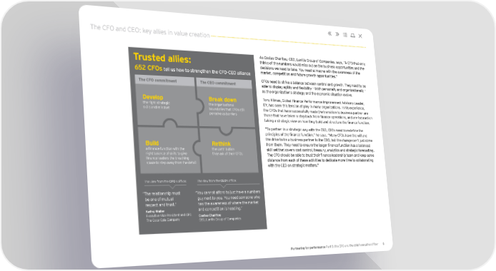The CFO and CEO: key allies in value creation As Costas Charitou, CEO, Lanitis Group of Companies, says, “A CFO that only Trusted allies: thinks of the numbers would miss out on the business opportunities and the decisions we need to take. You need someone with the awareness of the 652 CFOs tell us how to strengthen the CFO-CEO alliance market, competition and future growth opportunities.” CFOs need to strike a balance between control and growth. They need to be The CFO commitment The CEO commitment able to display agility and flexibility — both personally and organizationally — as the organization’s strategy and the economic situation evolve. Develop Break down Tony Klimas, Global Finance Performance Improvement Advisory Leader, the right strategic the organizational EY, has seen this tension at play in many organizations. In his experience, skills and mindset boundaries that CFOs still the CFOs that have successfully made the transition to business partner are perceive as barriers those that have taken a step back from finance operations, and are focused on taking a strategic view on how they build and structure the finance function. “To partner in a strategic way with the CEO, CFOs need to redefine the principles of the finance function,” he says. “Many CFOs have the will and the drive to be a business partner to the CEO, but the change can’t just come Build Rethink from them. They need to ensure the larger finance function has a balanced a finance function with the the contribution skill set that covers cost control, treasury, analytics and strategic forecasting. right balance of skills to give they ask of their CFOs The CFO should be able to trust their finance leadership team and keep some finance leaders the breathing distance from each of these activities to dedicate more time to collaborating space to step away from the detail with the CEO on strategic matters.” The view from the CFO’s office: The view from the CEO’s office: “The relationship must “You cannot afford to just have a numbers be one of mutual guy next to you. You need someone who respect and trust.” has the awareness of where the market Kathy Waller and competition is heading.” Executive Vice President and CFO, Costas Charitou The Coca-Cola Company CEO, Lanitis Group of Companies Partnering for performance Part 5: the CFO and the chief executive officer 6