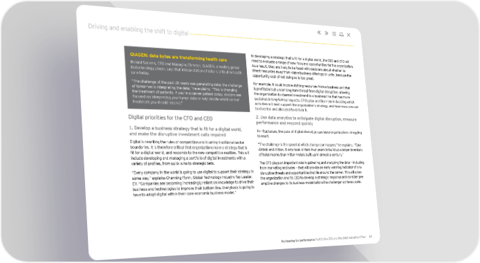 Driving and enabling the shift to digital In developing a strategy that is fit for a digital world, the CEO and CFO will QIAGEN: data bytes are transforming health care need to evaluate a range of new risks and opportunities for the organization. Roland Sackers, CFO and Managing Director, QIAGEN, a leading global As a result, they are likely to be faced with decisions about whether to biotechnology player, says that interpretation of data is critical in health direct resources away from viable business offerings or units, because the care today. opportunity cost of not doing so is too great. “The challenge of the past 20 years was generating data; the challenge For example, it could involve shifting resources from a business unit that of tomorrow is interpreting the data,” he explains. “This is changing is profitable but under long-term threat from digital disruption, allowing the treatment of patients. If you’re a cancer patient today, doctors are the organization to channel investment to a business line that has more focused on interpreting your tumor data to help decide which kind of sustainable long-term prospects. CFOs play a critical role in deciding which treatment you should receive.” activities will best support the organization’s strategy, and how resources can be diverted and allocated to deliver it. Digital priorities for the CFO and CEO 2. Use data analytics to anticipate digital disruption, measure performance and respond quickly 1. Develop a business strategy that is fit for a digital world, For Buchanan, the pace of digital disruption can leave organizations struggling and make the disruptive investment calls required to react. Digital is rewriting the rules of competition and blurring traditional sector “The challenge is the speed at which change can happen,” he explains. “Take boundaries. It is therefore critical that organizations have a strategy that is Airbnb and Hilton. It only took Airbnb four years to build up a larger inventory fit for a digital world, and responds to the new competitive realities. This will of hotel rooms than Hilton Hotels built up in almost a century.” include developing and managing a portfolio of digital investments with a variety of profiles, from quick wins to strategic bets. The CFO plays an important role in gathering and analyzing the data — including “Every company in the world is going to use digital to support their strategy in from marketing and sales — that will provide an early-warning indicator of any some way,” explains Channing Flynn, Global Technology Industry Tax Leader, disruptive threats and opportunities that lie around the corner. This will allow EY. “Companies are becoming increasingly reliant on knowledge to drive their the organization and its CEO to develop a strategic response and consider pre- business and technologies to improve their bottom line. Everybody is going to emptive changes to its business model before the challenger achieves scale. have to adopt digital within their core economic business model.” Partnering for performance Part 5: the CFO and the chief executive officer 14