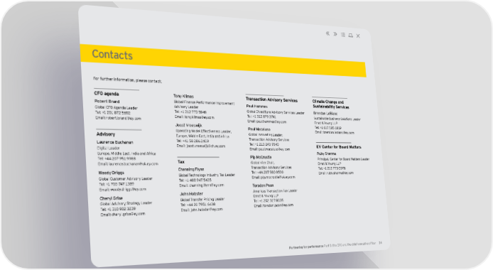 Contacts For further information, please contact: CFO agenda Tony Klimas Transaction Advisory Services Climate Change and Robert Brand Global Finance Performance Improvement Paul Hammes Sustainability Services Global CFO Agenda Leader Advisory Leader Global Divestiture Advisory Services Leader Brendan LeBlanc Tel: +1 201 872 5692 Tel: +1 212 773 5949 Tel: +1 312 879 3741 Sustainable Business Solutions Leader Email: [email protected] Email: [email protected] Email: [email protected] Ernst & Young LLP Joost Vreeswijk Paul Macaluso Tel: +1 617 585 1819 Operating Model Effectiveness Leader, Email: [email protected] Advisory Europe, Middle East, India and Africa Global Innovation Leader, Tel: +41 58 286 2409 Transaction Advisory Services Laurence Buchanan Email: [email protected] Tel: +1 213 240 7040 EY Center for Board Matters Digital Leader Email: [email protected] Europe, Middle East, India and Africa Pip McCrostie Ruby Sharma Tel: +44 207 951 9988 Tax Principal, Center for Board Matters Leader Email: [email protected] Global Vice Chair, Ernst & Young LLP Channing Flynn Transaction Advisory Services Tel: +1 212 773 0078 Woody Driggs Global Technology Industry Tax Leader Tel: +44 207 980 0500 Email: [email protected] Global Customer Advisory Leader Tel: +1 408 947 5435 Email: [email protected] Tel: +1 703 747 1389 Email: [email protected] Torsdon Poon Email: [email protected] John Hobster Americas Transaction Tax Leader Cheryl Grise Global Transfer Pricing Leader Ernst & Young LLP Global Advisory Strategy Leader Tel: +44 20 7951 6438 Tel: +1 202 327 8005 Tel: +1 310 902 3239 Email: [email protected] Email: [email protected] Email: [email protected] Partnering for performance Part 5: the CFO and the chief executive officer 34