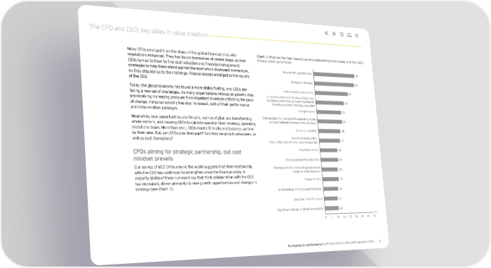 The CFO and CEO: key allies in value creation Many CFOs emerged from the chaos of the global financial crisis with Chart 1: What are the main reasons you are collaborating more closely with the CEO? reputations enhanced. They had found themselves at center stage, as their (Please select up to three) CEOs turned to them to find cost reduction and financial management strategies to help them shield against the economy’s downward momentum. New growth opportunities 34 As they stepped up to the challenge, finance leaders emerged as the key ally of the CEO. Changes in strategy 33 Today, the global economy has found a more stable footing, and CEOs are New products and services 27 facing a new set of challenges. As many organizations refocus on growth, they A need to understand the key performance are receiving increasing pressure from impatient investors criticizing the pace indicators (KPIs) that are most important in 23 of change. Personal scrutiny has also increased, both of their performance tracking successful strategy execution and remuneration packages. Cost pressures 20 Meanwhile, new opportunities and threats, such as digital, are transforming Change/plans for change in the operating model 20 siness whole sectors, and causing CEOs to call into question their strategy, operating or organizational structure of the bu model and team. More than ever, CEOs need a firm ally and business partner Economic volatility 18 by their side. But, can CFOs play their part? Can they be growth advocates, as well as cost champions? New or emerging risks 17 (e.g., cyber security, tax, social media risk) CFOs aiming for strategic partnership, but cost Regulatory issues 14 mindset prevails Encouragement from the CEO 14 Our survey of 652 CFOs around the world suggests that their relationship Change/plans for change in geographical with the CEO has continued to strengthen since the financial crisis. A footprint of the business 13 majority (64%) of those surveyed say that their collaboration with the CEO Change of CEO 13 has increased, driven primarily by new growth opportunities and changes in strategy (see Chart 1). Shortcomings in financial performance 12 Questions from the board 11 Significant merger or divestiture activity 11 % 0 5 10 15 20 25 30 35 40 Partnering for performance Part 5: the CFO and the chief executive officer 4