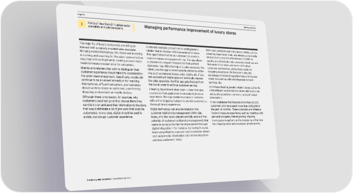PPage 50age 50 DCF and valuation pIndustry oaramevervieterws I Points of view from EY’s global sector Managing performance improvement of luxury stores specialists and outside experts The majority of luxury consumers are willing to A relevant example comes from a leading jewelry Both luxury retailers and many luxury hotels, such as interact with a digitally enabled sales associate. retailer that in October 2013 revealed an in-store a leading Asian hotel chain, are already using mobile Bringing mobile technology into stores and investing iPad application that helps customers to create a devices to increase the effectiveness of CRM: to in training and coaching for the sales representatives made-to-measure engagement ring. The app allows quickly and effectively help customers check out and may help enforce trust while creating an even-more customers to compare features for their perfect find products in store, and sales staff pull up made-to-measure experience for consumers. diamonds ring. With the help of a sales associate, the consumer preferences, giving them a tailored Brands and retailers that wish to distinguish their client uses the app to select specific elements of the shopping experience. On the hotel’s side, the customer experience should take into consideration ring such as diamond shape, color, clarity, etc. If you advantage of mobile integration helps with traveler the omni-channel approach. Specifically, mobile will are wondering if digital apps will eventually replace check in as well as with concierge and in-room continue to be an essential medium for reaching the sales associate, the iPad app gets the best from services, etc. international, affluent consumers, and marketers the two in order to enforce customer service. A US-based leading jewelry retailer stands out for its should work to create an optimized, user-friendly A leading department store chain in New York also CRM attitude: people into the stores able to provide shopping environment on mobile devices. created an iPad application to recreate its in-store outstanding customer service or product-related Although there is no reason, for example, why experience. The app combines products’ contents information. customers could not go online, choose items they with online shopping features to provide customers a It has a database that includes more than 60,000 want to try on and send that information to the store, thorough brand experience. customers who have spent more than US$5,000 in that would eliminate a lot of pre-work that could be Digital technology can also be helpful on the the past 18 months. These customers are offered a automated. In any case, digital should be used to customer relationship management (CRM) side: made-to-measure experience, such as: meetings with enrich, not disrupt customer experience. today, only few luxury players are fully aware of the personal shoppers, free engraving, shipping, potential of customer relationship management; that champagne receptions on the mezzanine of the New opens large opportunities for improvement through York flagship store and occasional private events. digital integration — for instance, by having the sales team using iPads to scan and record customer details and social media information and retrieve data from previous customers’ visits. The luxury and cosmetics financial factbook 2015