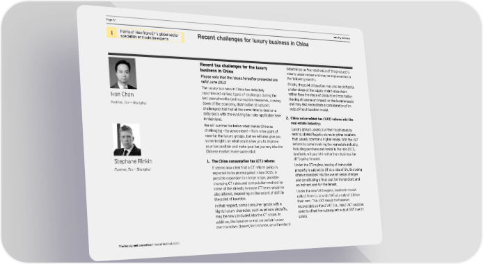PPage 52age 52 DCF and valuation pIndustry oaramevervieterws I Points of view from EY’s global sector Recent challenges for luxury business in China specialists and outside experts Recent tax challenges for the luxury determined on the retail value of the product) is business in China clearly under review and may be implemented in Please note that the issues hereafter presented are the following months. valid June 2015 Finally, the point of taxation may also be shifted to The luxury business in China has definitely a later stage of the supply chain/value chain experienced various types of challenges during the rather than the stage of production/importation Ivan Chan last years/months (anti-corruption measures, slowing (having of course an impact on the taxable basis) down of the economy, distribution structure’s and may also necessitate a consideration of an Partner, Tax — Shanghai challenges); but had at the same time to deal on a output/input taxation model. daily basis with the evolving tax rules applicable here 2. China value-added tax (VAT) reform into the in Mainland. real estate industry: We will summarize below what makes China so Luxury groups usually run their businesses by challenging — to some extent — from a tax point of renting stores/flagship stores in prime locations view for the luxury groups, but we will also give you that usually command higher rental. With the VAT some insights on what could allow you to improve reform to come involving the real estate industry, your tax position and make your tax journey into the including purchase and rental in the late 2015, Chinese market more successful: landlords will pay VAT rather than Business Tax Stephane Rinkin 1. The China consumption tax (CT) reform: (BT) going forward. Partner, Tax — Shanghai It seems now clear that a CT reform policy is Under the BT regime, leasing of immovable expected to be promulgated in late 2015. A property is subject to BT at a rate of 5%, this being possible expansion in charge scope, possible often embedded into the overall rental charges changing CT rates and computation method for and constituting a final cost for the landlord and some of the already in-scope CT items would be an indirect cost for the tenant. also altered, depending on the extent of shift in Under the new VAT regime, landlords should the point of taxation. collect from its tenants VAT at a rate of 11% on In that respect, some consumer goods with a their rent. This VAT should be however highly luxury character, such as private aircrafts, recoverable as input VAT (i.e., input VAT could be may be newly included into the CT scope. In used to offset the subsequent output VAT due on addition, the taxation or not on certain luxury sales). merchandises (based, for instance, on a threshold The luxury and cosmetics financial factbook 2015