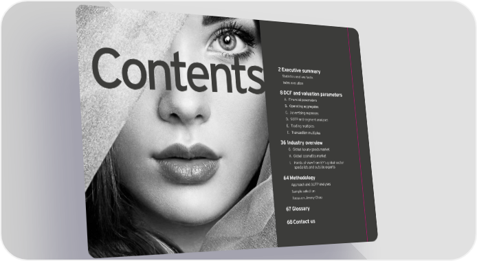 2 Executive summary Statistics and key facts Index evolution Contents 8 DCF and valuation parameters A. Financial parameters B. Operating aggregates C. Advertising expenses D. SOTP and segment analyses E. Trading multiples F. Transaction multiples 36 Industry overview G. Global luxury goods market H. Global cosmetics market I. Points of view from EY’s global sector specialists and outside experts 64 Methodology Approach and SOTP analyses Sample selection Focus on Jimmy Choo 67 Glossary Contact us 68