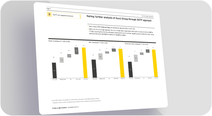 Page 22 DCF and valuation parameters D SOTP and segment analyses Kering: further analysis of Gucci Group through SOTP approach • Gucci Group SOTP analyses imply an enterprise value of €28.1b in FY15E. • Within the Gucci Group segment, the Gucci brand alone represents 49% of the top line and 61% of EBIT in FY15E, meaning that the Gucci brand is expected to constitute the largest segment within the Gucci Group and also the most profitable in terms of operating margin. Sales breakdown FY15E (in €b) EBIT breakdown FY15E (in €b) Enterprise value breakdown FY15E (in €b) 1.8 7.8 0.2 1.9 3.3 28.1 0.1 2.4 0.4 10% 7.0 12% 0.9 23% 7% 9% 1.3 1.2 15.3 11% 22% 3.8 25% 17% 61% 49% 54% Gucci brand Bottega Veneta YSL Other brands Gucci Group Gucci brand Bottega Veneta YSL Other brands Gucci Group Gucci brand Bottega Veneta YSL Other brands Gucci Group Source: SOTP based on EY analysis and on the following brokers reports: RBC Capital (11 February 2015), JP Morgan (11 February 2015), Societe Generale (18 February 2015) and Deutsche bank (23 February 2015) The luxury and cosmetics financial factbook 2015