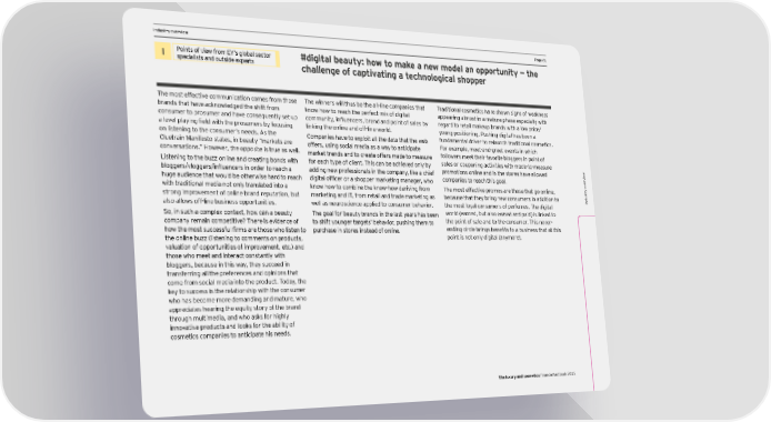 DCF and vIndustry oaluation pverview arameters PPage 61age 61 I Points of view from EY’s global sector #digital beauty: how to make a new model an opportunity — the specialists and outside experts challenge of captivating a technological shopper The most effective communication comes from those The winners will thus be the all-line companies that Traditional cosmetics have shown signs of weakness brands that have acknowledged the shift from know how to reach the perfect mix of digital appearing almost in a mature phase especially with consumer to prosumer and have consequently set up community, influencers, brand and point of sales by regard to retail makeup brands with a low price/ a level playing field with the prosumers by focusing linking the online and off-line world. young positioning. Pushing digital has been a on listening to the consumer’s needs. As the Companies have to exploit all the data that the web fundamental driver to relaunch traditional cosmetics. Cluetrain Manifesto states, in beauty “markets are offers, using social media as a way to anticipate For example, meet-and-greet events in which conversations.” However, the opposite is true as well. market trends and to create offers made to measure followers meet their favorite bloggers in point of Listening to the buzz online and creating bonds with for each type of client. This can be achieved only by sales or couponing activities with made-to-measure w bloggers/vloggers/influencers in order to reach a adding new professionals in the company, like a chief promotions online and in the stores have allowed companies to reach this goal. ervie huge audience that would be otherwise hard to reach digital officer or a shopper marketing manager, who v with traditional media not only translated into a know how to combine the know-how deriving from The most effective promos are those that go online, try o strong improvement of online brand reputation, but marketing and IT, from retail and trade marketing as because that they bring new consumers in addition to Indus also allows off-line business opportunities. well as neuroscience applied to consumer behavior. the most loyal consumers of perfumes. The digital So, in such a complex context, how can a beauty The goal for beauty brands in the last years has been world (earned, but also owned and paid) is linked to company remain competitive? There is evidence of to shift younger targets’ behavior, pushing them to the point of sale and to the consumer. This never- how the most successful firms are those who listen to purchase in stores instead of online. ending circle brings benefits to a business that at this the online buzz (listening to comments on products, point is not only digital (anymore). valuation of opportunities of improvement, etc.) and those who meet and interact constantly with bloggers, because in this way, they succeed in transferring all the preferences and opinions that come from social media into the product. Today, the key to success is the relationship with the consumer who has become more demanding and mature, who appreciates hearing the equity story of the brand through multimedia, and who asks for highly innovative products and looks for the ability of cosmetics companies to anticipate his needs. The luxury and cosmetics financial factbook 2015