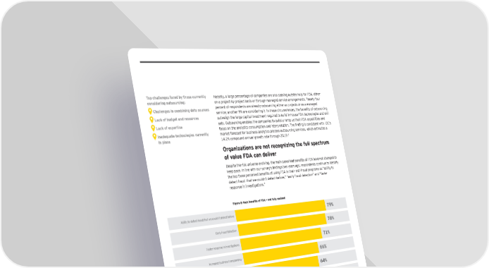 Top challenges faced by those currently Notably, a large percentage of companies are also seeking outside help for FDA, either considering outsourcing: on a project-by-project basis or through managed service arrangements. Twenty-four Challenges in combining data sources percent of respondents are already outsourcing either as projects or as a managed service; another 9% are considering it. In these circumstances, the benefits of outsourcing Lack of budget and resources outweigh the large capital investment required to build in-house FDA technologies and skill Lack of expertise sets. Outsourcing enables the companies to quickly ramp up their FDA capabilities and focus on the analytics consumption and interpretation. The finding is consistent with IDC’s Inadequate technologies currently market forecast for business analytics process outsourcing services, which estimates a in place 2 14.2% compound annual growth rate through 2019. Organizations are not recognizing the full spectrum of value FDA can deliver Despite the risk universe evolving, the main perceived benefits of FDA have not changed to keep pace. In line with our survey’s findings two years ago, respondents continue to identify the top three perceived benefits of using FDA in their anti-fraud programs as “ability to detect fraud that we couldn’t detect before,” “early fraud detection” and “faster response in investigations.” Figure 8: Main benefits of FDA — not fully realized Ability to detect fraud that we couldn’t detect before 79% Early fraud detection 78% Faster response in investigations 71% Increased business transparency 66% Getting the business to take more responsibility 64% for managing the company's anti-fraud program Reduced costs of anti-fraud program 42% Q. What do you think are the main benefits of using FDA in your anti-fraud program? Base: All respondents (665) The “Other” percentages have been omitted to allow better comparison among the responses given. Multiple answers allowed, may exceed 100%. As indicated in Figure 8, although the top three selected benefits of using FDA are clearly important, both from risk mitigation and cost avoidance perspectives, it is surprising to see how few respondents selected “reduced costs of anti-fraud program.” Only two in five see the potential for FDA to reduce the costs of their anti-fraud programs as a main benefit. By using current technology capabilities and leading analytics to help focus investigative and compliance monitoring efforts, FDA can be an important enabler of cost reduction. 2 IDC Worldwide Business Analytics Services Forecast, 2015–2019, November 2015. 16 | Global Forensic Data Analytics Survey 2016