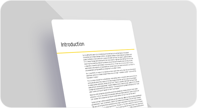 Introduction Surrounding this year’s 21st Conference of the Parties to the United Nations Framework Convention on Climate Change (COP21), increasing numbers of multinational businesses and global institutions have come out in support of carbon pricing. This report, commissioned by EY’s Climate Change and Sustainability Services practice, highlights the findings from a survey exploring the prevailing views of businesses around the world toward carbon pricing, as both a regulatory necessity and strategic corporate priority. It finds not only that carbon pricing is welcomed by the majority of respondents as the best way to cut carbon emissions, but that it is also expected to bring benefits to companies in a number of areas. On 1 June 2015, six major oil companies wrote an open letter saying that they would be able to take faster action on climate change if there was a stronger — eventually global — carbon pricing 1 framework in place. This is a sharp change from a decade ago, when energy sector companies were more commonly raising doubts about the urgency of climate change rather than actively supporting strategies to reduce carbon emissions. What’s driven this? “There is a growing likelihood that we will see some price on carbon established,” explains Mathew Nelson, Deputy Global Leader of EY’s Climate Change and Sustainability Services practice. “The conversation is gradually changing from ‘if and when’ carbon pricing will happen to ‘how’ it will happen.” More than 430 companies around the world have already set internal prices for their carbon emissions. In 2014, the number of companies setting an internal price for carbon stood at just 150. Another 583 companies say they will adopt carbon pricing in the next two years.2 “Carbon pricing is widely accepted today as one of the most effective tools to reduce greenhouse gas emissions,” says Lila Karbassi, Head of Environment and Climate at the UN Global Compact. “We see a lot of signals from businesses across regions and sectors that using a price on carbon is an effective means to reducing emissions. Through our Business Leadership Criteria on Carbon Pricing,3 nearly 60 companies have committed to setting, advocating and reporting a meaningful price on carbon.” This is confirmed by the respondents to our survey, 54% of whom believe carbon pricing is the most effective way to cut carbon emissions. Although carbon-pricing frameworks such as the European Emissions Trading System (EU ETS) and national carbon taxes are already a fact of life for some companies, a growing number are taking voluntary steps to implement an internal price for carbon in anticipation of such regulations in their operating markets. In time for the COP21 meeting in December 2015, EY conducted this new study, surveying more than 100 executives from around the world that have an impact on their company strategies. The following are the key findings that highlight their attitudes to carbon pricing. We see a lot of signals from businesses across regions and sectors that using a price on carbon is an effective means to reducing emissions. 1 ‘Six Oil Majors Say: We Will Act Faster with Stronger Carbon Pricing,’ UNFCCC, June 1, 2015 http://newsroom.unfccc.int/unfccc- newsroom/major-oil-companies-letter-to-un/. 2 ‘Threefold surge in companies disclosing carbon price shows climate change concerns going mainstream,’ CDP, September 21, 2015 https://www.cdp.net/en-US/News/CDP%20News%20Article%20Pages/surge-in-companies-disclosing-carbon-price.aspx . 3 See the Caring for Climate Business Leadership Criteria on Carbon Pricing: http://caringforclimate.org/workstreams/carbon-pricing/ . Shifting the carbon pricing debate I 3