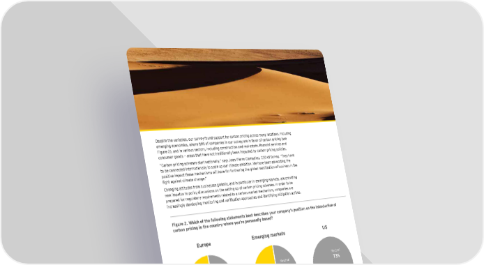 Despite the variables, our survey found support for carbon pricing across many locations, including emerging economies, where 59% of companies in our survey are in favor of carbon pricing (see Figure 2), and in various sectors, including construction and real estate, financial services and consumer goods — areas that have not traditionally been impacted by carbon pricing policies. “Carbon pricing schemes start nationally,” says Jean-Pierre Clamadieu, CEO of Solvay. “They have to be connected internationally to scale up our climate ambition. We have been advocating the positive impact these mechanisms will have for furthering the global mobilization of business in the fight against climate change.” Changing attitudes from businesses globally, and in particular in emerging markets, are providing new impetus to policy discussions on the setting up of carbon pricing schemes. In order to be prepared for regulatory requirements related to a carbon market mechanism, companies are increasingly developing monitoring and verification approaches and identifying mitigation actions. Figure 2. Which of the following statements best describes your company’s position on the introduction of carbon pricing in the country where you’re personally based? Europe Emerging markets US Neutral Neutral Neutral 31% 34% 73% In favor In favor 64% 59% In favor 5% 18% Against 7% 9% Against Against In order to be prepared for regulatory requirements related to a carbon market mechanism, companies are increasingly developing monitoring and verification approaches and identifying mitigation actions. Shifting the carbon pricing debate I 5