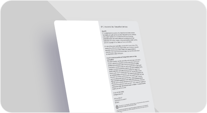 EY | Assurance | Tax | Transactions | Advisory About EY EY is a global leader in assurance, tax, transaction and advisory services. The insights and quality services we deliver help build trust and confidence in the capital markets and in economies the world over. We develop outstanding leaders who team to deliver on our promises to all of our stakeholders. In so doing, we play a critical role in building a better working world for our people, for our clients and for our communities. EY refers to the global organization, and may refer to one or more, of the member firms of Ernst & Young Global Limited, each of which is a separate legal entity. Ernst & Young Global Limited, a UK company limited by guarantee, does not provide services to clients. For more information about our organization, please visit ey.com. How EY’s Global Automotive and Transportation center can help your business The global recession reset the automotive sector landscape. As the sector recovers, automotive companies across the value chain must focus on profitable and sustainable growth, financial and operational stability, investments in new technologies and seizing opportunities in high-growth markets. If you lead an automotive business, you need to anticipate trends, identify implications and make informed decisions that support your business goals. Our EY’s Global Automotive and Transportation enables our worldwide network of more than 7,000 sector-focused assurance, tax, transaction and advisory professionals to share powerful insights and deep sector knowledge with businesses like yours. These insights, combined with our technical experience in every major global automotive market, will help you to accelerate strategies and improve performance. Whichever segment of the automotive sector you are in — from component suppliers to commercial or light vehicle manufacturers or retailers — we can provide the insights you need to succeed. © 2014 EYGM Limited. All Rights Reserved. EYG no. ED0127 CSG/GSC2014/1449477 ED None In line with EY’s commitment to minimize its impact on the environment, this document has been printed on paper with a high recycled content. This material has been prepared for general informational purposes only and is not intended to be relied upon as accounting, tax or other professional advice. Please refer to your advisors for specific advice. ey.com/automotive