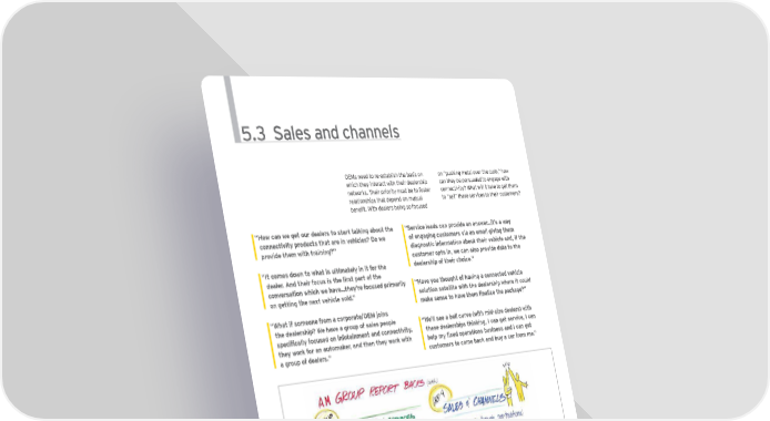 5.3 Sales and channels OEMs need to re-establish the basis on on “pushing metal over the curb,” how which they interact with their dealership can they be persuaded to engage with networks. Their priority must be to foster connectivity? What will it take to get them relationships that depend on mutual to “sell” these services to their customers? benefit. With dealers being so focused “How can we get our dealers to start talking about the “Service leads can provide an answer…it’s a way connectivity products that are in vehicles? Do we of engaging customers via an email giving them provide them with training?” diagnostic information about their vehicle and, if the customer opts in, we can also provide data to the “It comes down to what is ultimately in it for the dealership of their choice.” dealer. And their focus is the first part of the conversation which we have…they’re focused primarily “Have you thought of having a connected vehicle on getting the next vehicle sold.” solution satellite with the dealership where it could make sense to have them finalize the package?” “What if someone from a corporate/OEM joins the dealership? We have a group of sales people “We’ll see a bell curve (with mid-size dealers) with specifically focused on infotainment and connectivity, these dealerships thinking, I can get service, I can they work for an automaker, and then they work with help my fixed operations business and I can get a group of dealers.” customers to come back and buy a car from me.” The quest for telematics 4.0 | 23