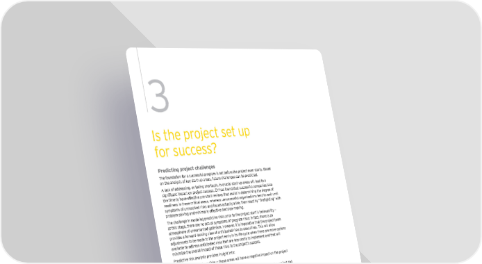 3 Is the project set up for success? Predicting project challenges The foundation for a successful program is set before the project even starts. Based on the analysis of key start-up areas, future challenges can be predicted. A lack of addressing, or taking shortcuts, in crucial start-up areas will lead to a significant impact on project success. EY has found that successful companies take the time to have effective pre-start reviews that assist in determining the degree of readiness in these critical areas, whereas unsuccessful organizations tend to wait until symptoms of unresolved risks and issues actually arise, then react by “firefighting” with problem solving and minimally effective decision-making. The challenge in modeling predictive risks prior to the project start is believability — at this stage, there are no actual symptoms of program risks; in fact, there is an atmosphere of unwarranted optimism. However, it is imperative that the project team provides a forward-looking view of anticipated risks to executives. This will allow adjustments to be made to the project early in its life cycle when there are more options available to address anticipated risks that are less costly to implement and that will minimize the overall impact of those risks to the project’s success. Predictive risk analysis provides insight into: • Areas that introduce risks — these areas will have a negative impact on the project and should be the focus of mitigation plans • Areas that mitigate risks — these areas will have a positive impact on the project and should be maintained and, if possible, strengthened • Risk neutral areas — these areas will have a marginal impact to the project, but this is often where low-effort improvements can have a high impact on success A forward-looking pattern-based analysis is critical in determining if projects are set up for success. The challenge is that most techniques used in industry today fall short in properly determining those aspects crucial for project execution effectiveness. A predictive risk analysis examines vital areas (project selection, governance and accountabilities; project management and the deadline effect; project team capability, discipline, credibility and multi-team collaboration; and supplier capacity) to determine if any of these are introducing risk, mitigating risk, or are neutral areas that could be improved. The resulting analysis will provide a visual view for all areas so that a determination can be made regarding the individual and/or combined area’s potential impact to project success more easily. Unlocking the value of your program investments | 7